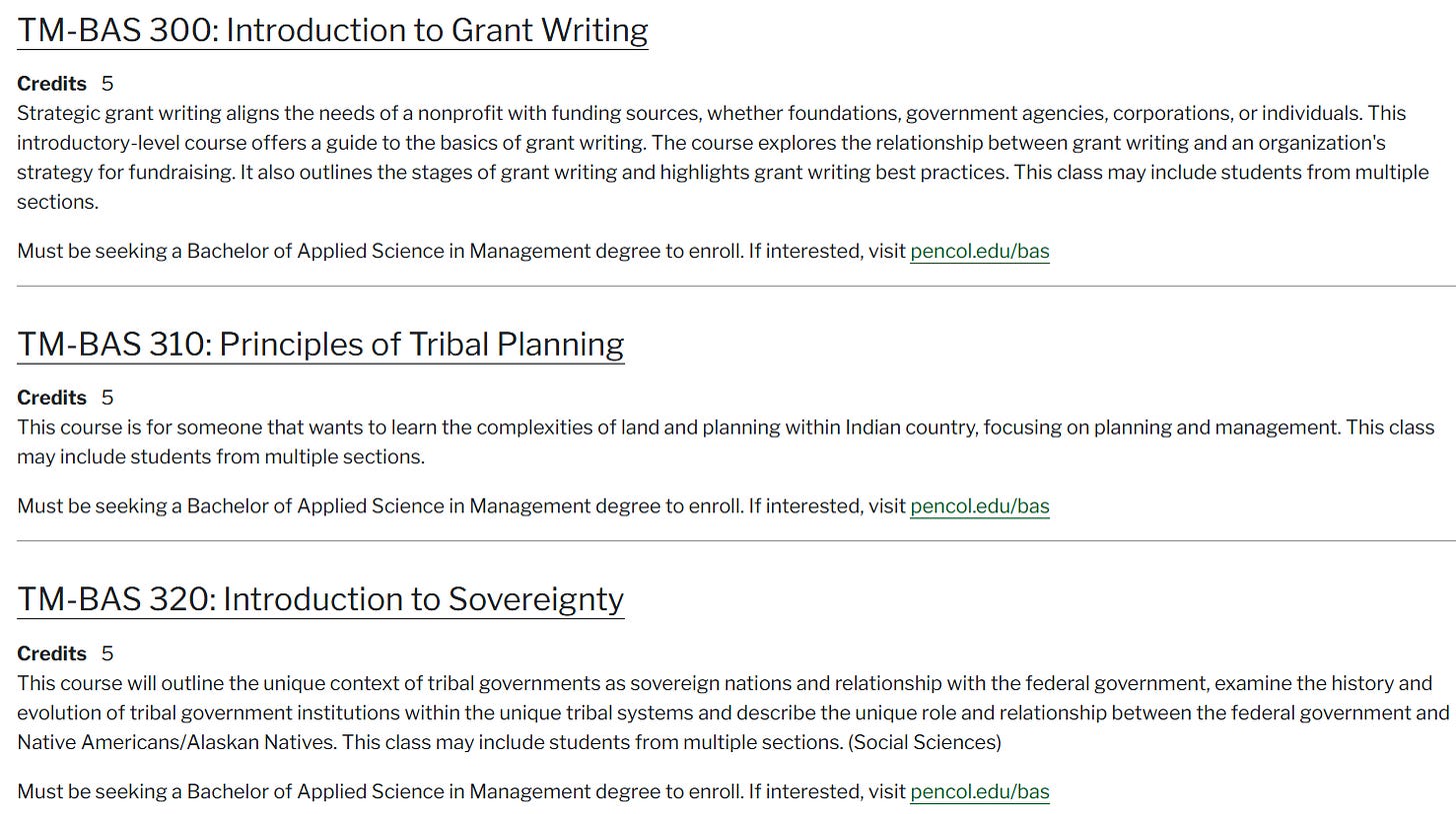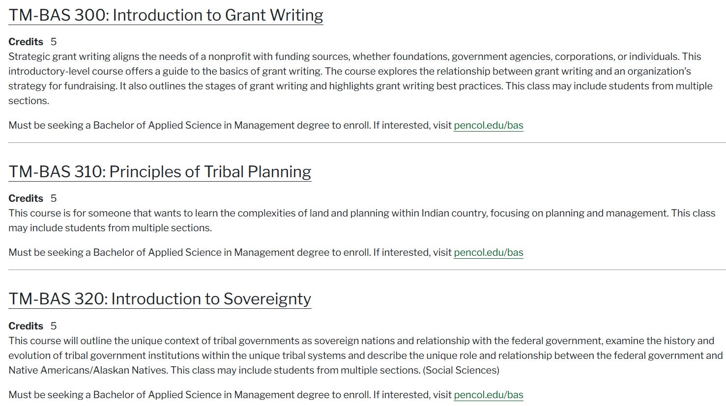 8 tribal management courses, including “sovereignty” and “tribal jurisdictions”
