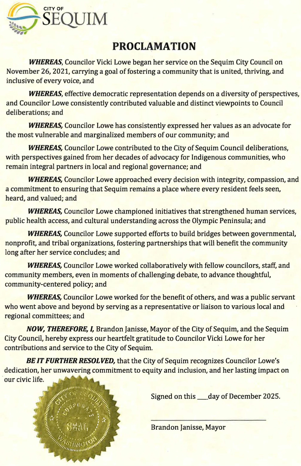 The Sequim City Council issued a proclamation honoring Councilor Vicki Lowe, praising her advocacy for inclusivity, marginalized communities, tribal partnerships, and human services. The proclamation highlights integrity, compassion, and bridge-building.