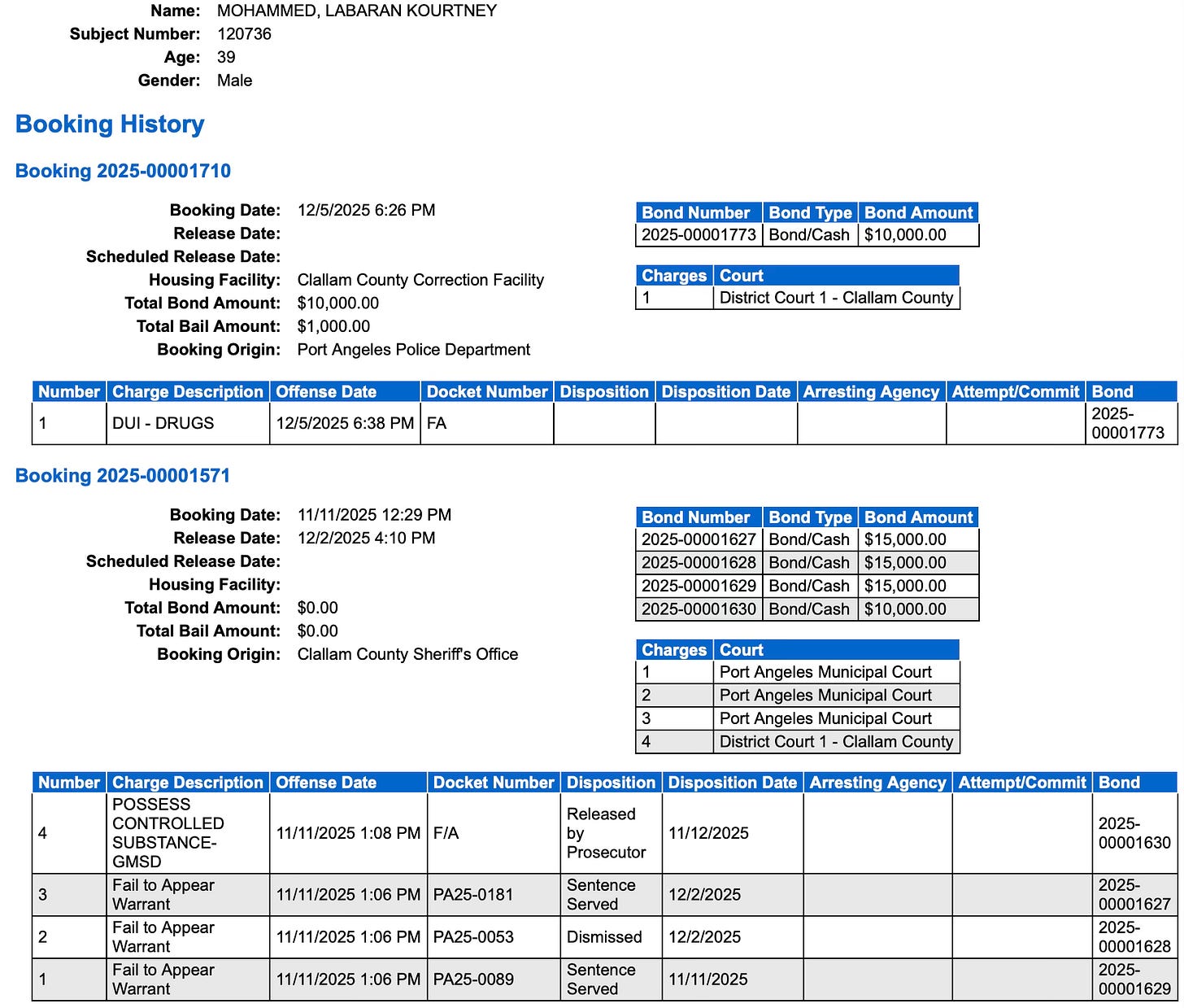 Labaran Kourtney Mohammed—previously covered by CC Watchdog for arriving from the Los Angeles area and repeatedly cycling in and out of Clallam County Jail on drug-related charges—is once again in custody. This time, it’s DUI-drugs.