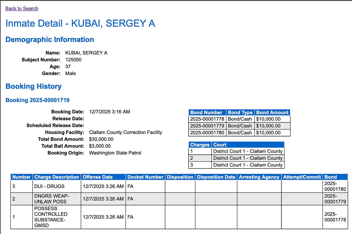 On Sunday, 37-year-old Sergey A. Kubai was booked into Clallam County Jail for DUI-drugs, unlawful possession of a dangerous weapon, and possession of a controlled substance. His name may be new to Clallam County, but his history is not new to law enforcement—particularly in Montana.