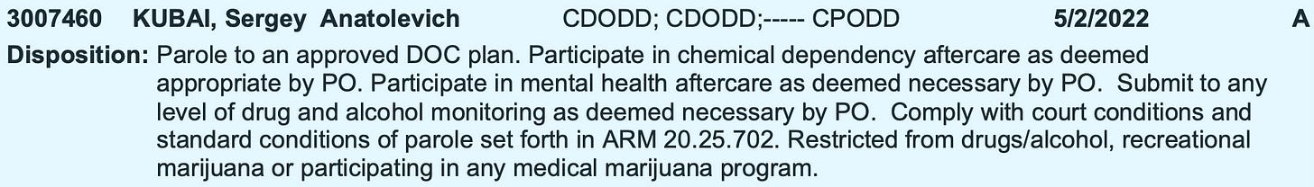 The Montana Parole Board’s public records further document repeated supervision concerns. Conditions included strict bans on drugs and alcohol, mandatory mental health and chemical dependency aftercare, employment restrictions, and the highest level of supervision. In one case, parole “commencement was denied” altogether.
