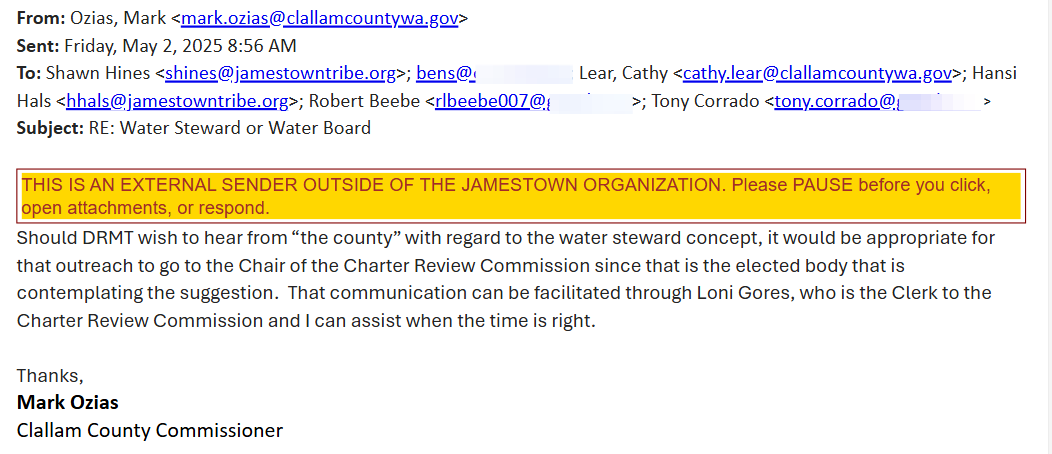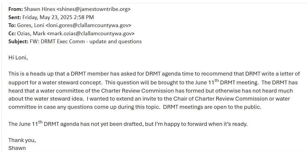 “Should DRMT wish to hear from ‘the county’ with regard to the water steward concept, it would be appropriate for that outreach to go to the Chair of the Charter Review Commission since that is the elected body that is contemplating the suggestion. That communication can be facilitated through Loni Gores, who is the Clerk to the Charter Review Commission and I can assist when the time is right.”