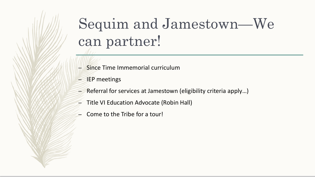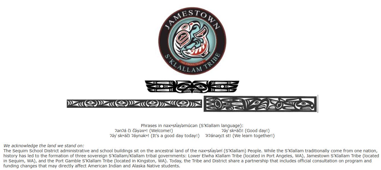 “We acknowledge the land we stand on: The Sequim School District administrative and school buildings sit on the ancestral land of the nəxʷsƛ̕ay̕əm̕ (S’Klallam) People. While the S’Klallam traditionally come from one nation, history has led to the formation of three sovereign S’Klallam/Klallam tribal governments: Lower Elwha Klallam Tribe (located in Port Angeles, WA), Jamestown S’Klallam Tribe (located in Sequim, WA), and the Port Gamble S’Klallam Tribe (located in Kingston, WA). Today, the Tribe and District share a partnership that includes official consultation on program and funding changes that may directly affect American Indian and Alaska Native students.” — Sequim School District land acknowledgement