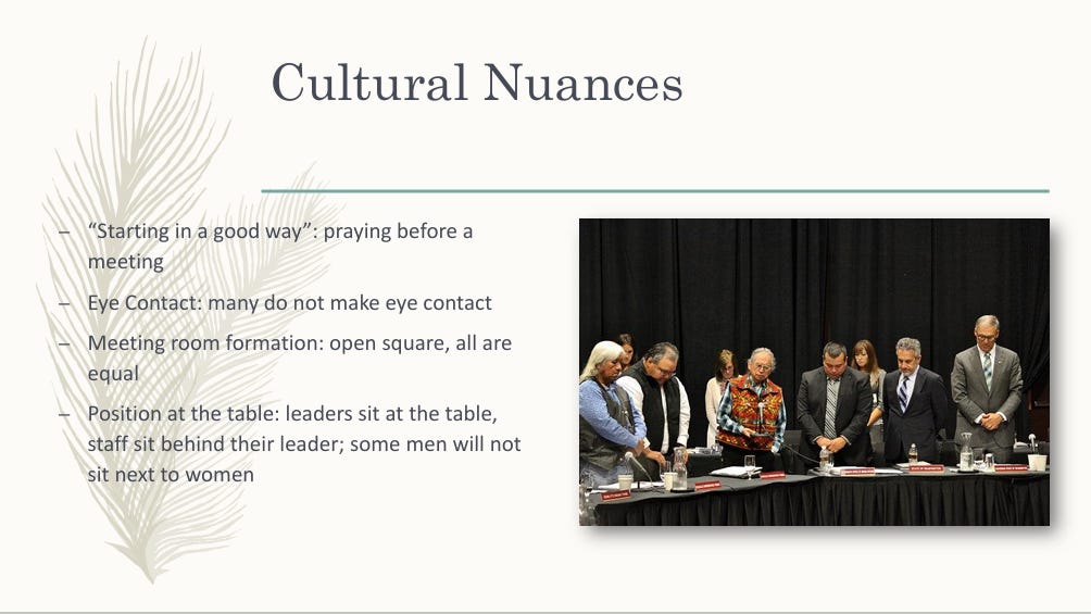 In 2018, the Jamestown S’Klallam Tribe gave a presentation to the Sequim School Board titled “Cultural Sensitivity.” It framed history in terms of colonizers and victims, with a heavy focus on how public institutions must transform themselves to honor tribal perspectives. Words like “healing,” “acknowledgement,” and “sovereignty” dominated the slides—not math, not reading, and certainly not science.