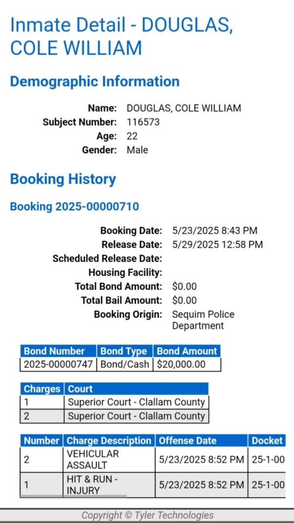 Twelve-year-old Colton Dufour was left with a broken pelvis and serious injuries after a hit-and-run while skateboarding on Spruce Street behind the Sequim Safeway in March. The suspect, Cole Douglas, was captured in Oklahoma on May 22 and extradited to Clallam County. He faced charges of vehicular assault and hit-and-run with injury.