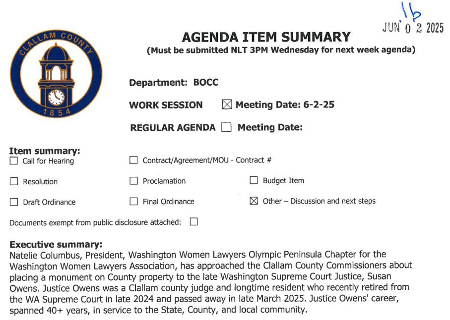 County Commissioners are now considering placing a monument for Justice Susan Owens on county property. Owens was a Clallam County judge, Washington Supreme Court justice, and tribal court judge for two tribes. She notably concurred in the decision to strike down Washington’s death penalty as racially biased.