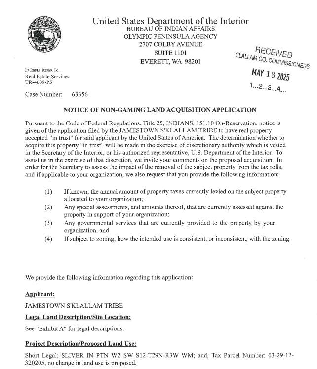 The Bureau of Indian Affairs has, once again, invited Clallam County to weigh in on another parcel being converted into trust land by the Jamestown Tribe. They're asking basic questions—like what property taxes are being lost and what government services are currently provided. But for at least a decade, Clallam’s commissioners have refused to respond.
