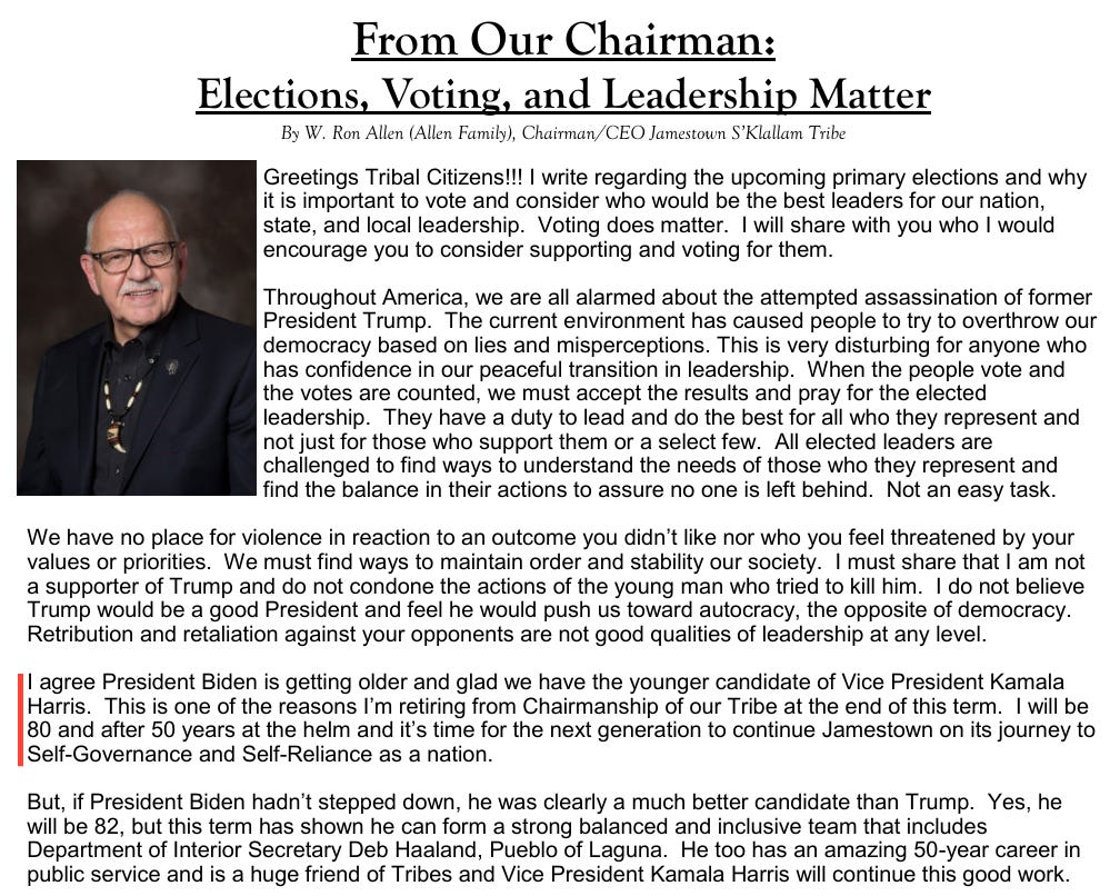 Jamestown CEO Ron Allen publicly announced in August 2024 that he’d step down as chairman by year’s end. He wrote, “I agree President Biden is getting older and glad we have the younger candidate of Vice President Kamala Harris. This is one of the reasons I’m retiring from Chairmanship of our Tribe at the end of this term. I will be 80 and after 50 years at the helm and it’s time for the next generation to continue Jamestown on its journey to Self-Governance and Self-Reliance as a nation.”