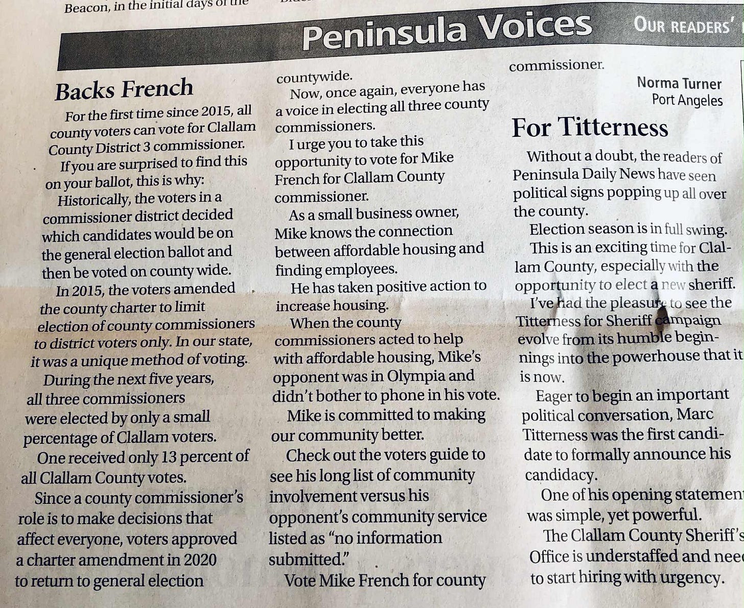 Mike French’s county commmissioner career was secured by Charter Review changes driven by League of Women Voters Presdient Norma Turner. Her letter to the editor promised housing solutions and action from then Port Angeles City Councilmember French. Two and a half years later, housing is less affordable, taxes are higher, and millions have been sunk into failed projects like Towne Road.
