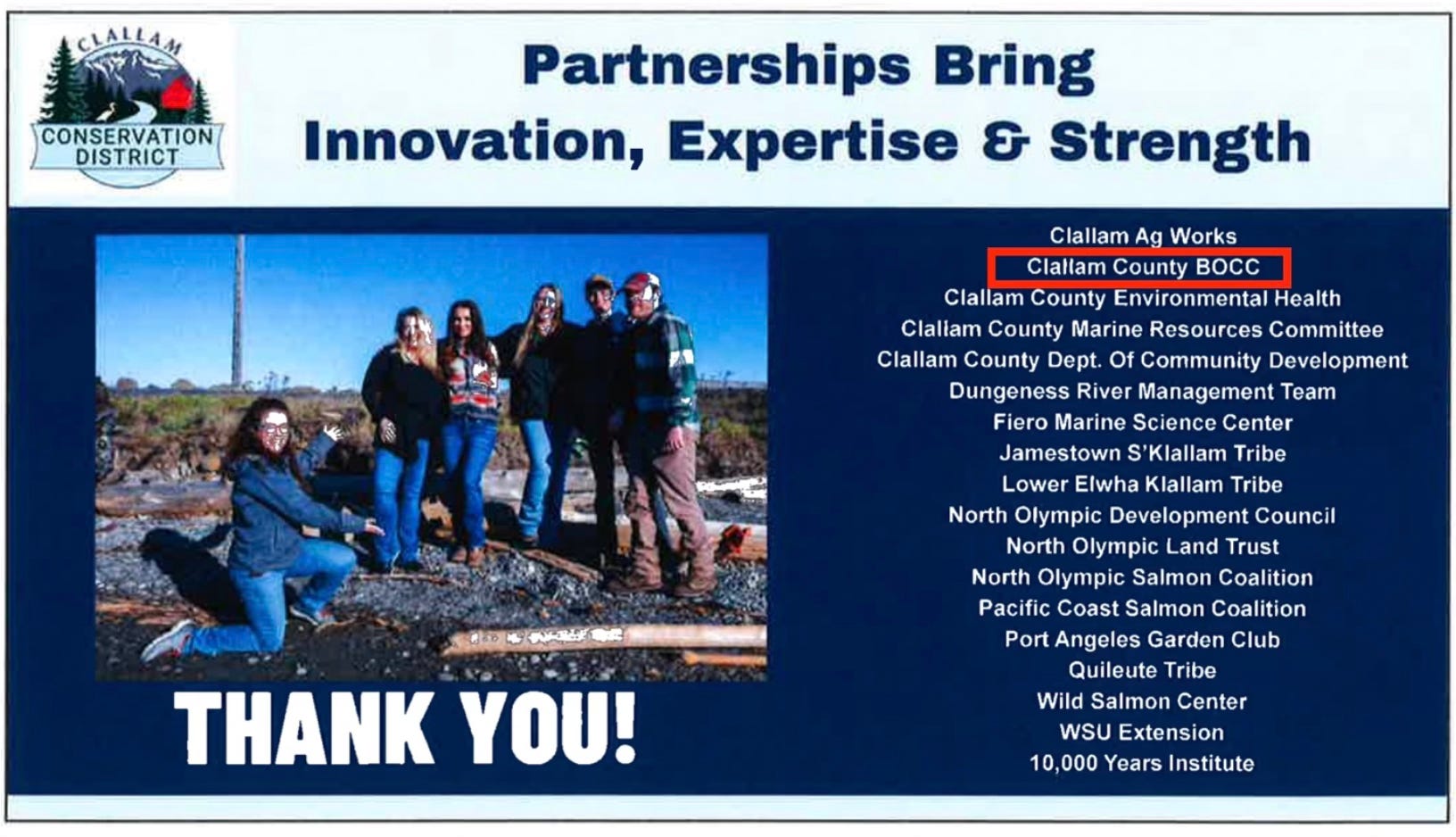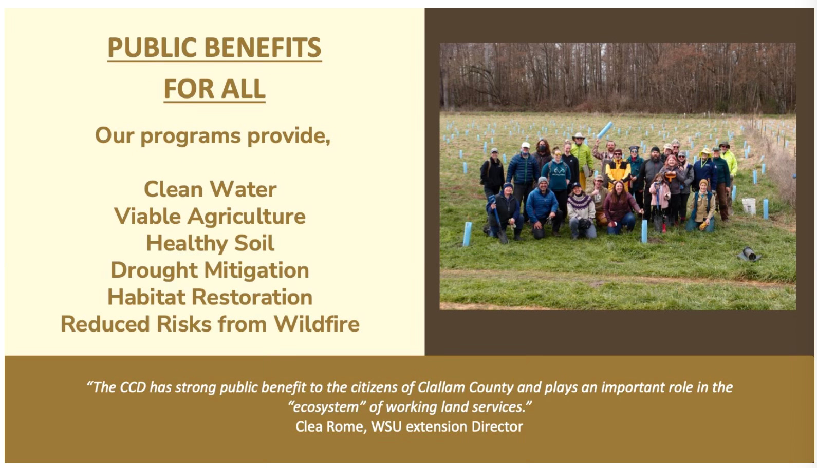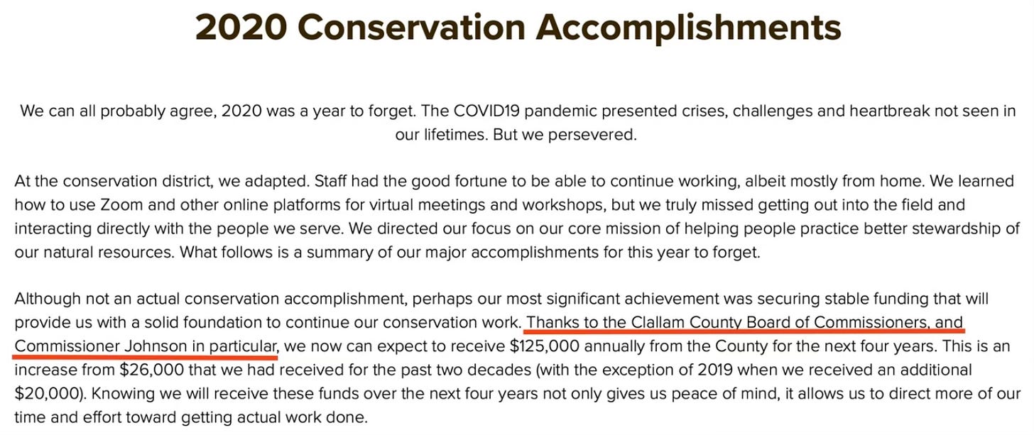 CCD’s April 2021 Newsletter praised the commissioners: “Thanks to the Clallam County Board of Commissioners, and Commissioner Johnson in particular, we now can expect to receive $125,000 annually from the County for the next four years.”