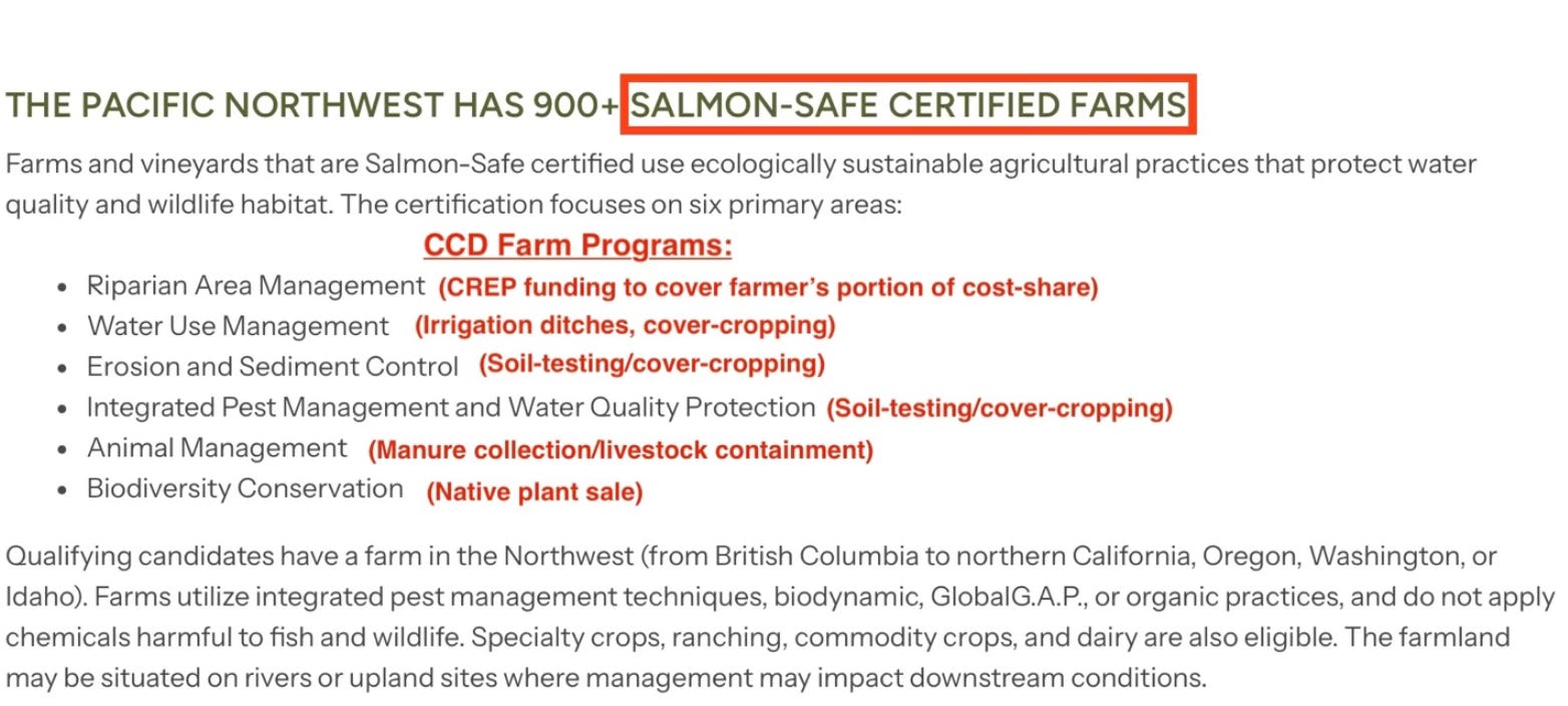 Yet, even these efforts closely mirror the “Salmon-Safe” certification promoted by the Cascadia Conservation District, CCD’s counterpart in Chelan County. Listed below are CCD services that promote the requirements placed upon Salmon-Safe certified farms.