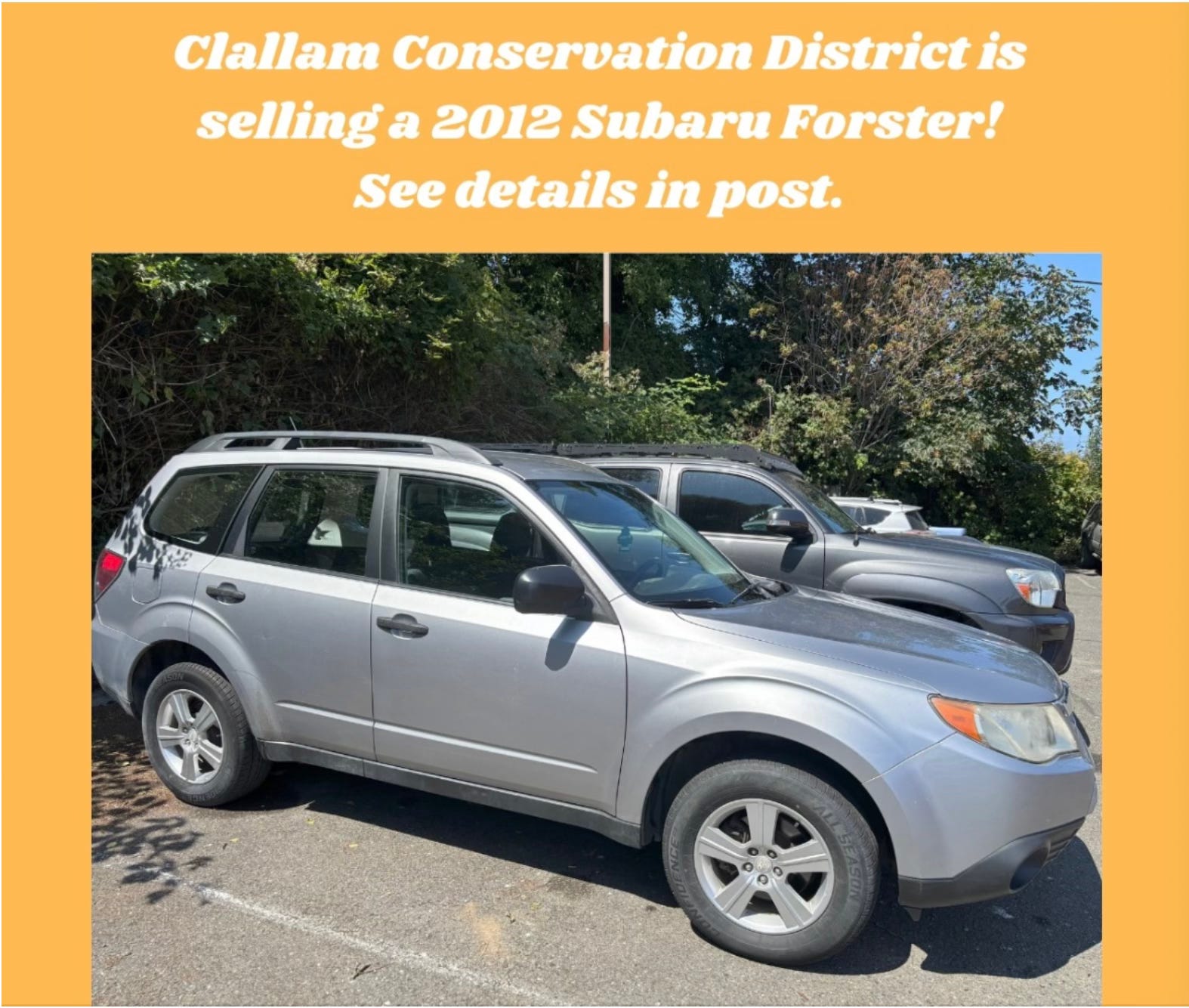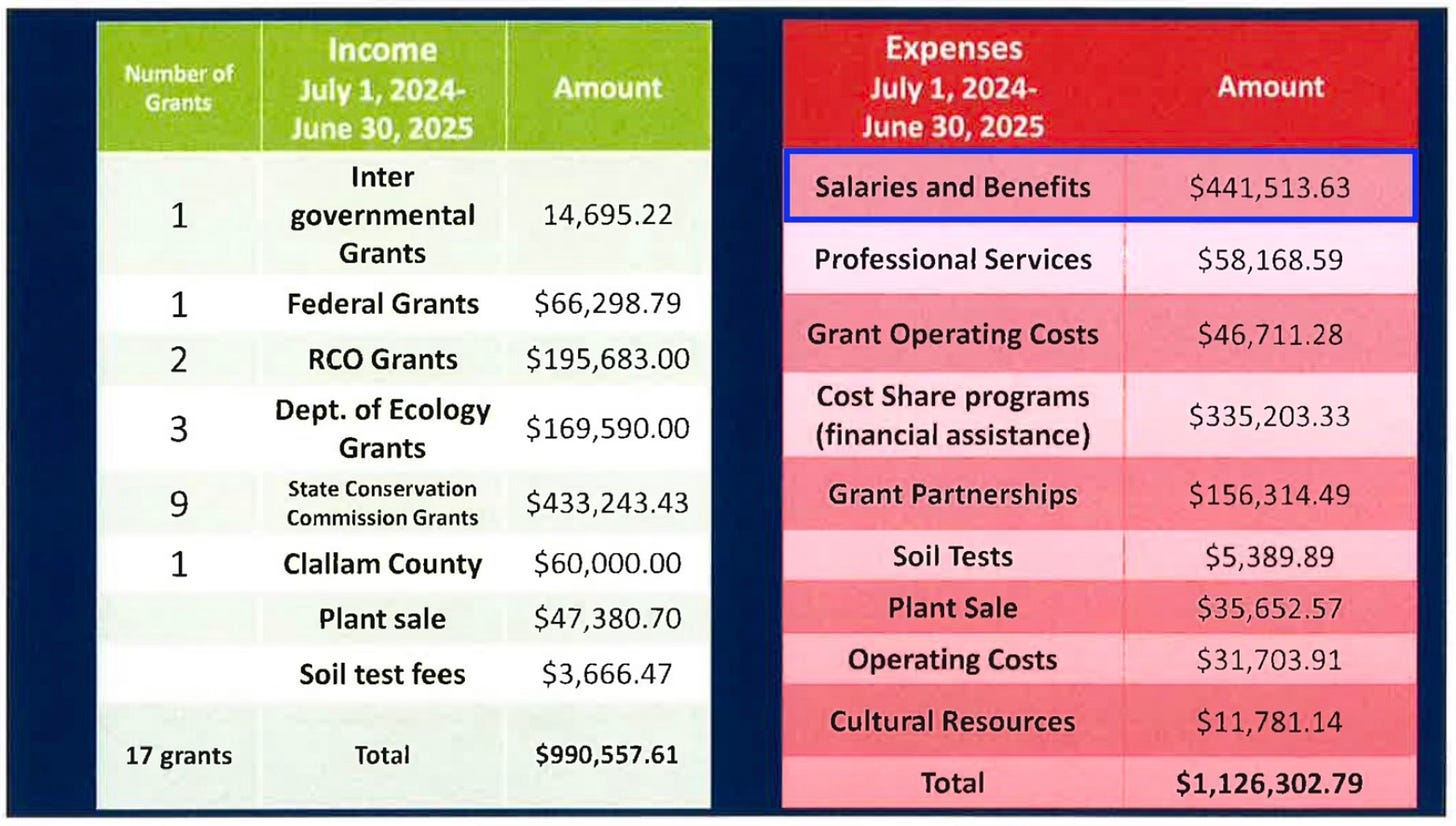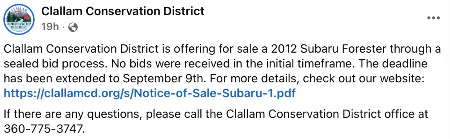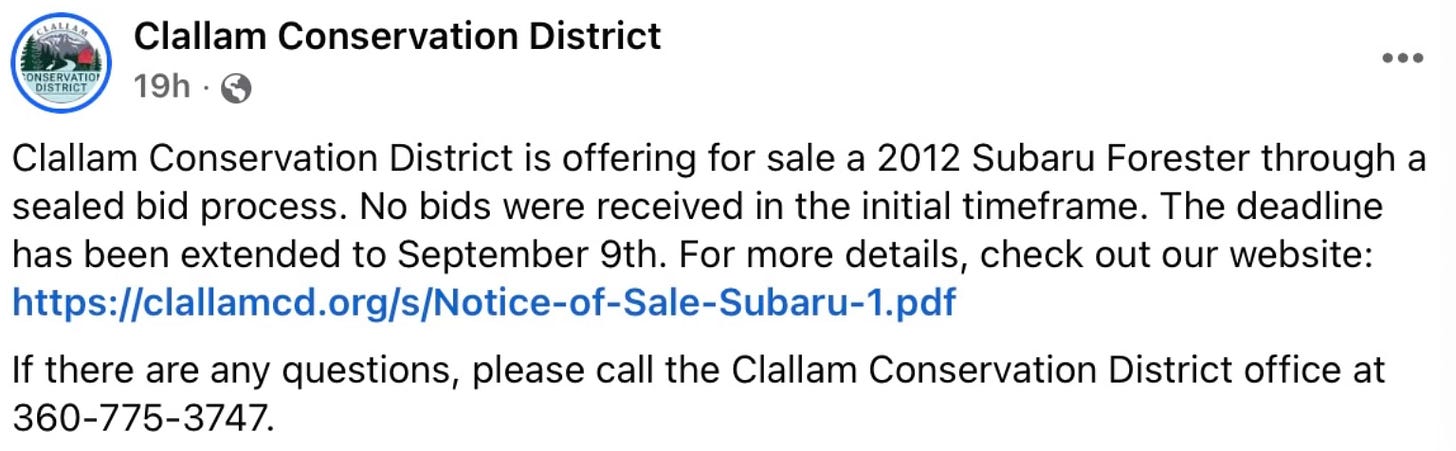 But who should pay to back-stop this growing grant-fueled team? Since 2019, Clallam taxpayers have already provided CCD with $730,000 in “stable funding” through the county’s general fund. In return, what alternative, sustainable sources of funding—beyond the proposed parcel fee—has CCD explored during that time? To date, their most ambitious effort seems to be auctioning a 2012 Subaru with a minimum bid of $8,500 (thanks, Kärin)!