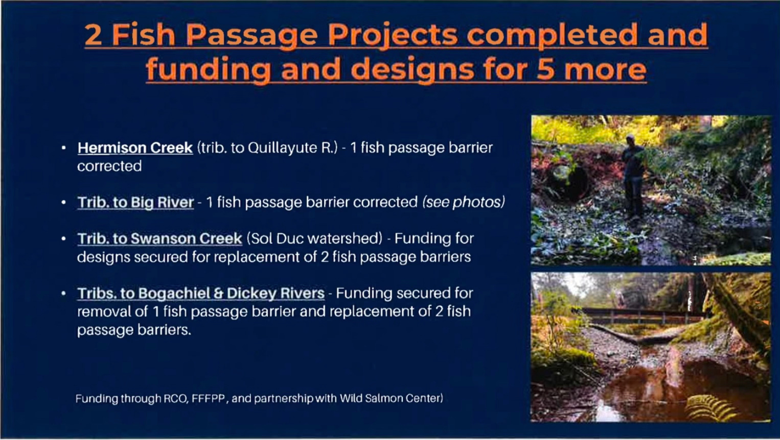 Fish passage projects are similarly resource-intensive.