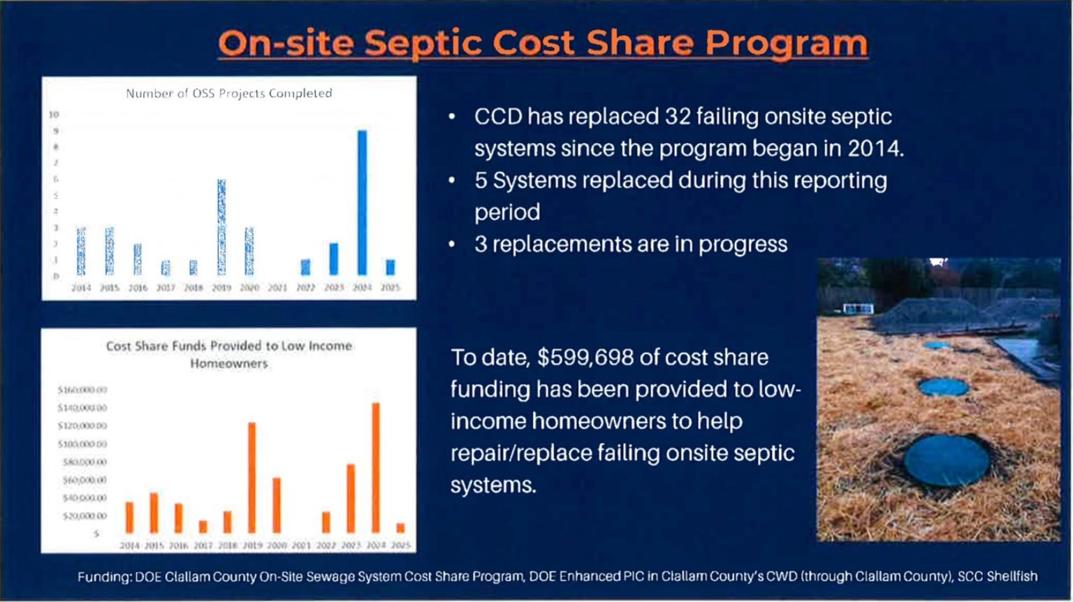 But only a handful of septic systems are replaced annually, and this, too, is driven by salmon preservation. Ms. Williams elaborated, “Our [criteria for septic replacement] are very specific for the resource concern. They have to be close to salmon-bearing waterways or water that goes into a salmon-bearing stream.”