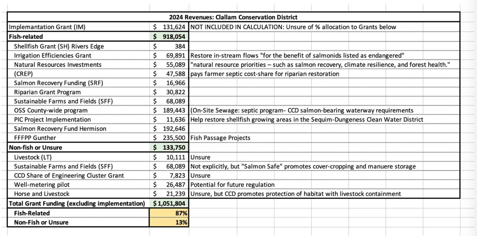 Examining CCD’s 2024 grant funding confirms its fish-centric philosophy. A conservative calculation demonstrates that at least 87% of grant funding is tied directly to fish or fish habitat efforts.