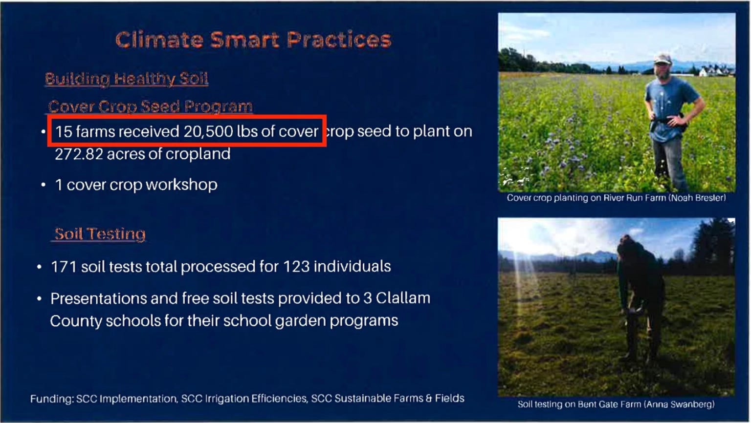 Since CCD does not actively promote traditional fertilization techniques, soil testing seems to function as a funnel for its cover-crop program, which supports salmon habitat.