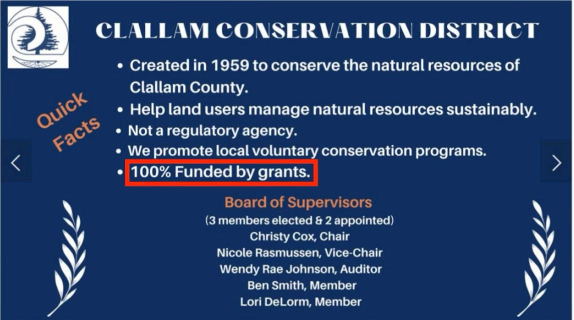The Clallam Conservation District (CCD), an entity that relies entirely on government handouts, wants the Board of Clallam County Commissioners to impose a $5 annual parcel fee on property owners. The fee would generate about $200,000 per year for the next decade—and any unpaid fees would become a lien against your property (RCW 89.08.405(6)).