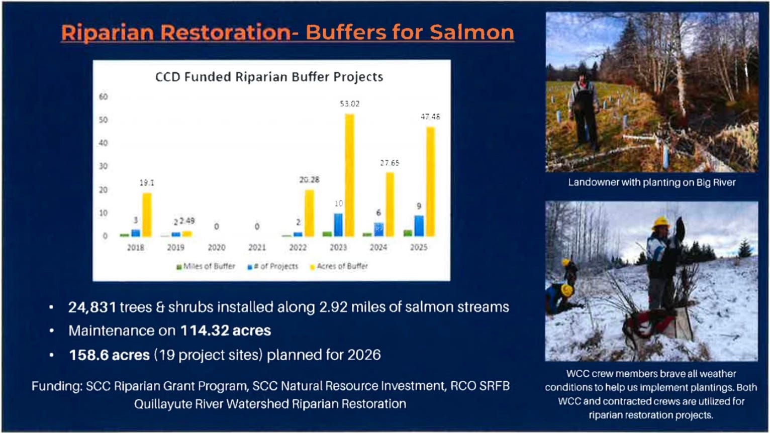 In her August 8 update to the county commissioners, District Manager Kim Williams highlighted the intensive effort behind restoring just 2.92 miles of fish habitat over the past year. The work included planting 24,831 trees and shrubs across 19 sites spanning 158.6 acres, clearing invasive blackberry thickets, and committing to five years of ongoing buffer maintenance.