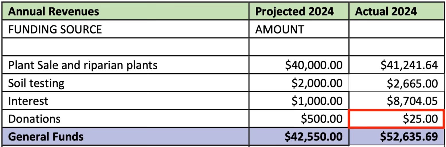 Grants do not always cover all indirect costs, which is why CCD’s constant refrain is, “We need stable funding!” CCD claims that this “stable funding” is “critical to cover expenses that grants do not fund, such as grant-writing and presentations, our soil testing program, elections, and rising operational costs.”