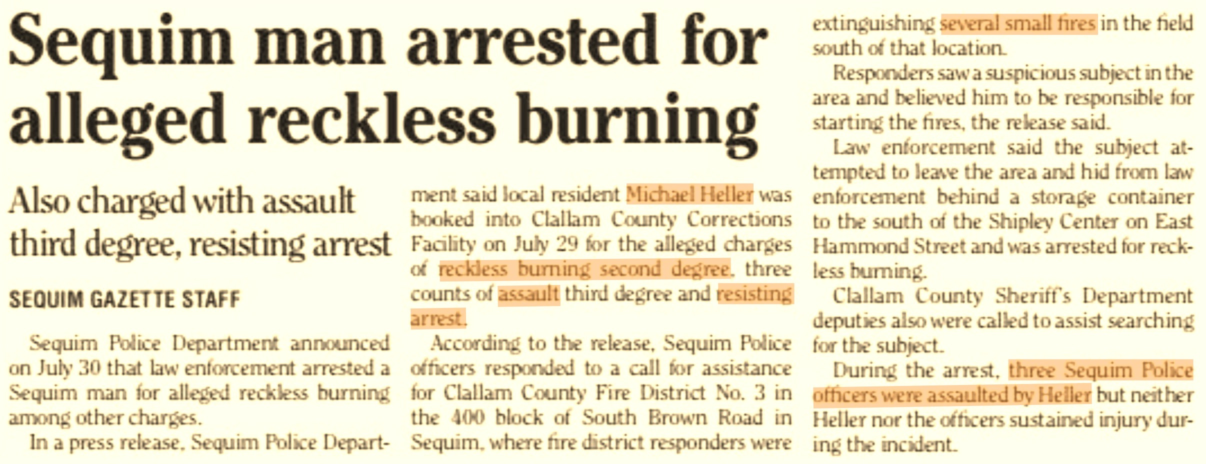 In 2018, Heller was charged with multiple counts of reckless burning and assaulting officers after allegedly setting fires near Sequim’s Olympic Discovery Trail and near South Brown Road. He was ordered to undergo a competency evaluation. Seven years later, he’s still cycling through the same pattern—disturbance, arrest, release, repeat.