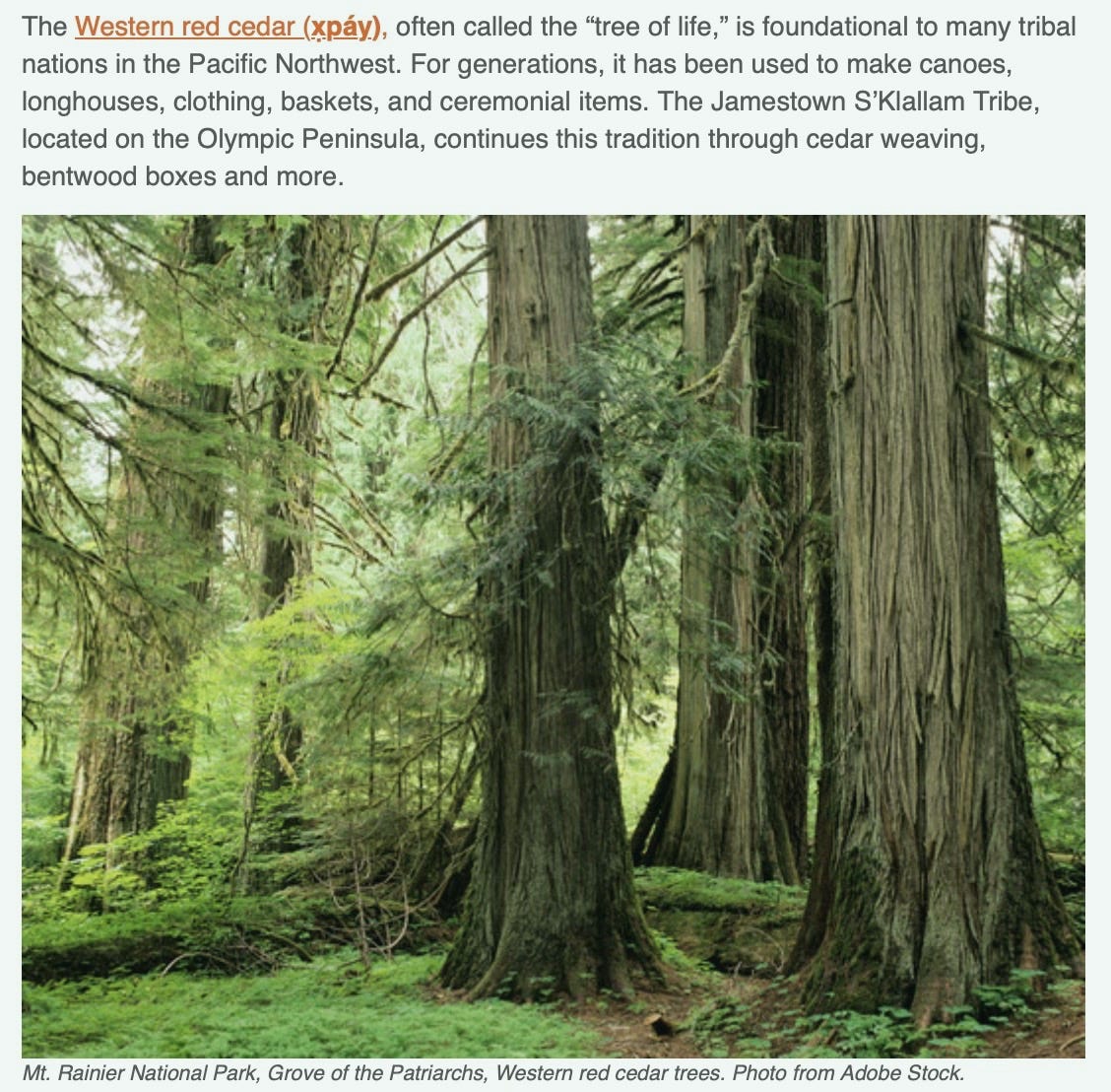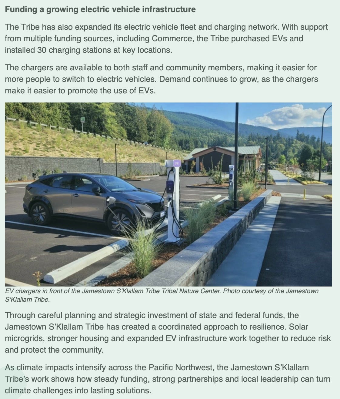 The Commerce press release frames the Tribe as a “model for energy resiliency,” describing investments in solar microgrids, housing upgrades, and electric vehicle infrastructure. It also features imagery of western red cedar trees located in Mount Rainier National Park — underscoring cultural heritage and climate impacts.