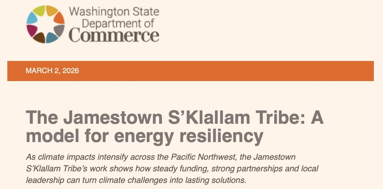 At the same time, the Washington State Department of Commerce recently highlighted more than $3.3 million in climate and resilience funding awarded between 2024 and 2026 to the Jamestown S’Klallam Tribe — specifically its governmental and corporate arms operating in Clallam County.