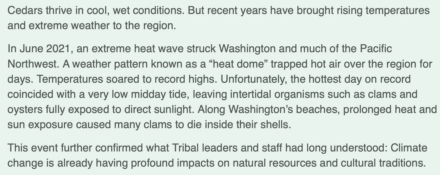 No one disputes that cedar is culturally significant or that climate events — including the 2021 heat dome — affected shellfish along Washington’s coastline. The press release notes that extreme heat coincided with low tide, resulting in shellfish mortality. What it does not mention is that shellfish aquaculture is also a major commercial enterprise for the Jamestown corporate structure, with geoducks and oysters sold into lucrative overseas markets.