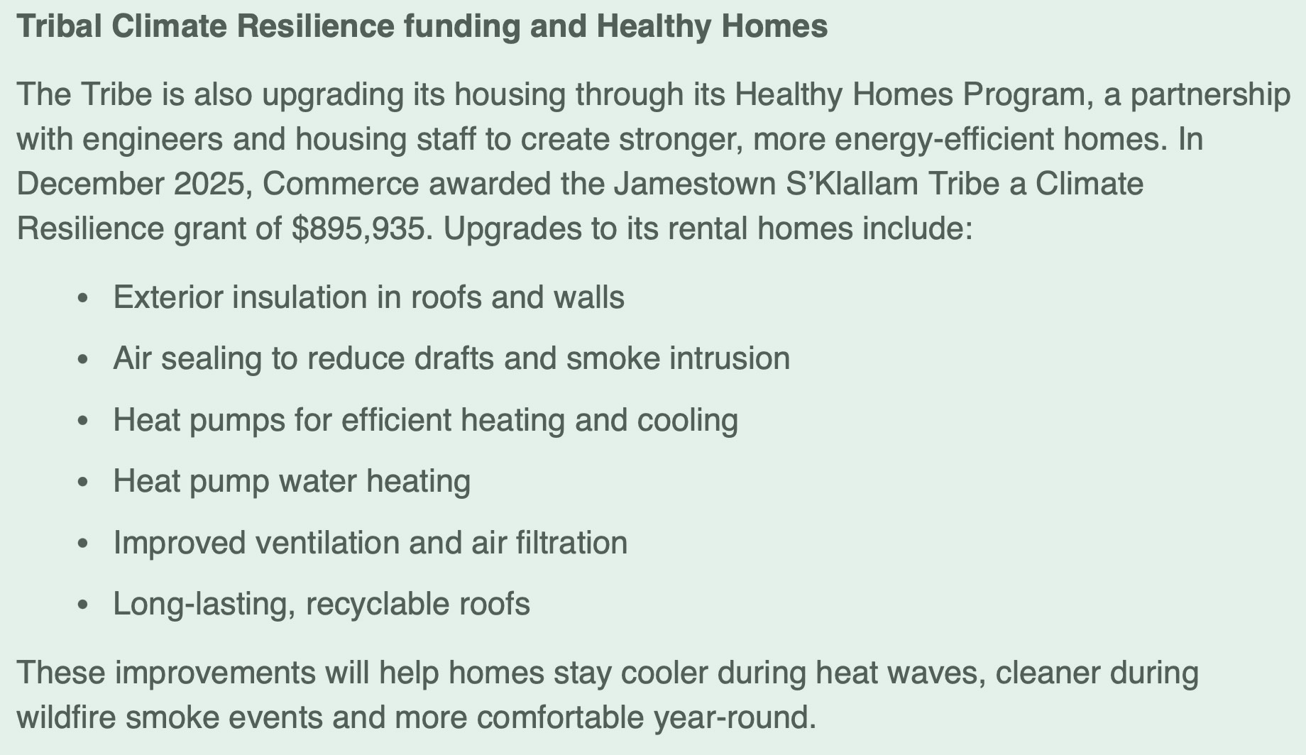 Commerce also awarded $895,935 in Climate Resilience funding for housing upgrades through the Tribe’s Healthy Homes Program. The work includes added insulation, heat pumps, improved ventilation, and longer-lasting roofing — all upgrades that make homes more efficient and more comfortable.