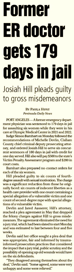 On June 24, 2024, former OMC emergency room doctor Josiah Hill was sentenced in Clallam County Superior Court to 179 days in jail for assaulting six female patients under his care in 2021 and 2022. Judge Simon Barnhart ordered six concurrent 180-day sentences, minus one day of credit served, along with financial penalties and no-contact orders protecting each of the six women.