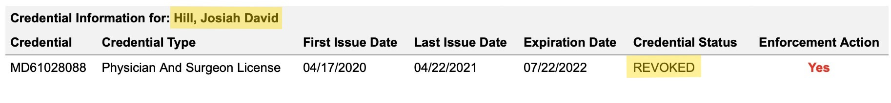 In July 2022, soon after his arrest, the Washington State Department of Health suspended Hill’s medical license pending legal action. That license—#MD61028088—is now officially listed as “revoked.”