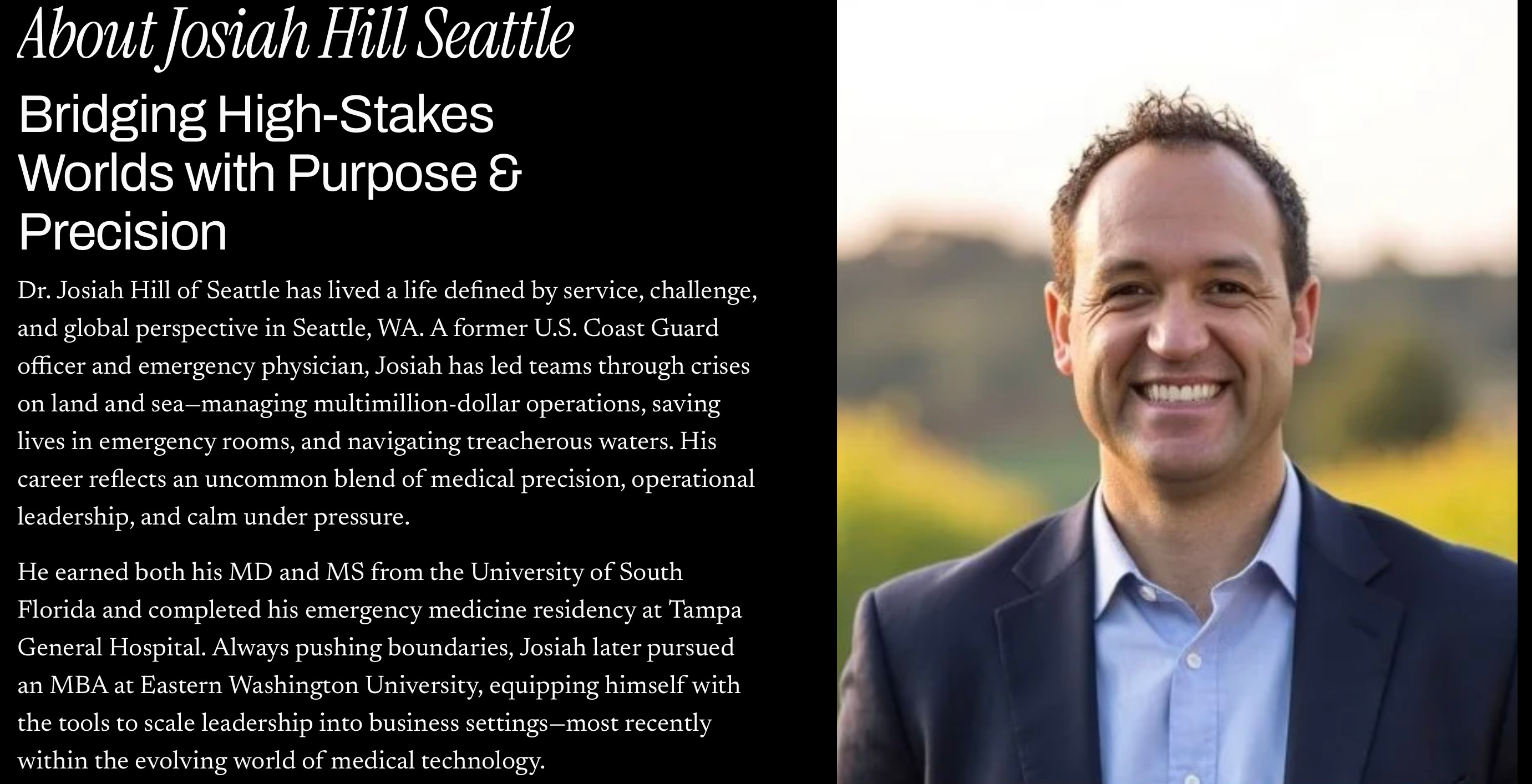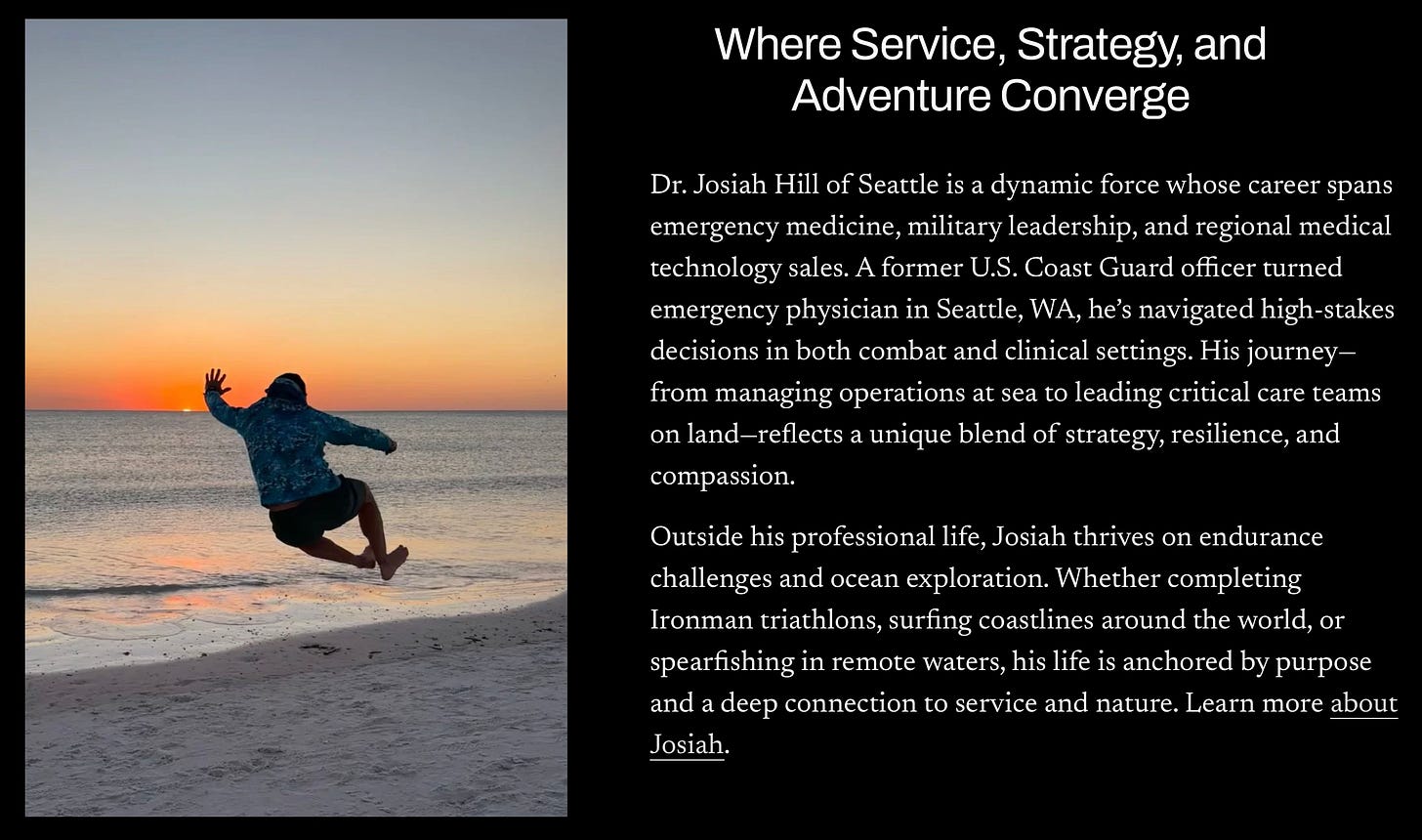 The site highlights his medical training, military service, global travel, and athletic accomplishments, using branding language such as “mission-first,” “precision,” “resilience,” and “operational leadership.”