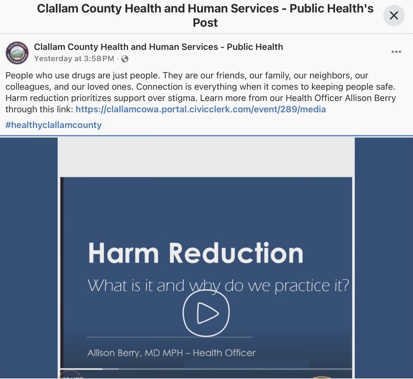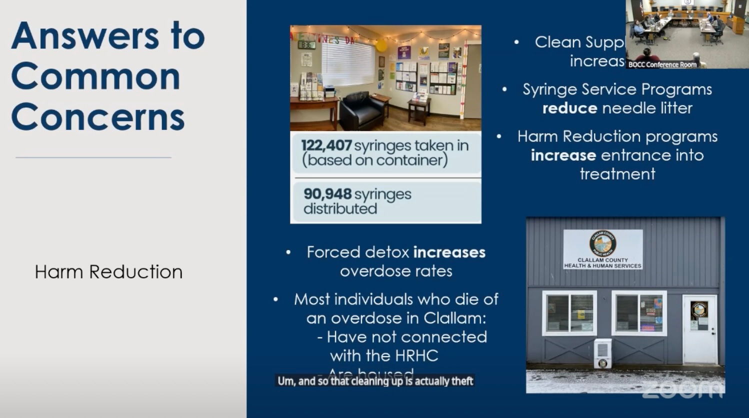 Yet, despite harm reduction’s abysmal record in Clallam County, Dr. Berry continues to label dissenters as “misinformed,” and she clings to its effectiveness (57:20):