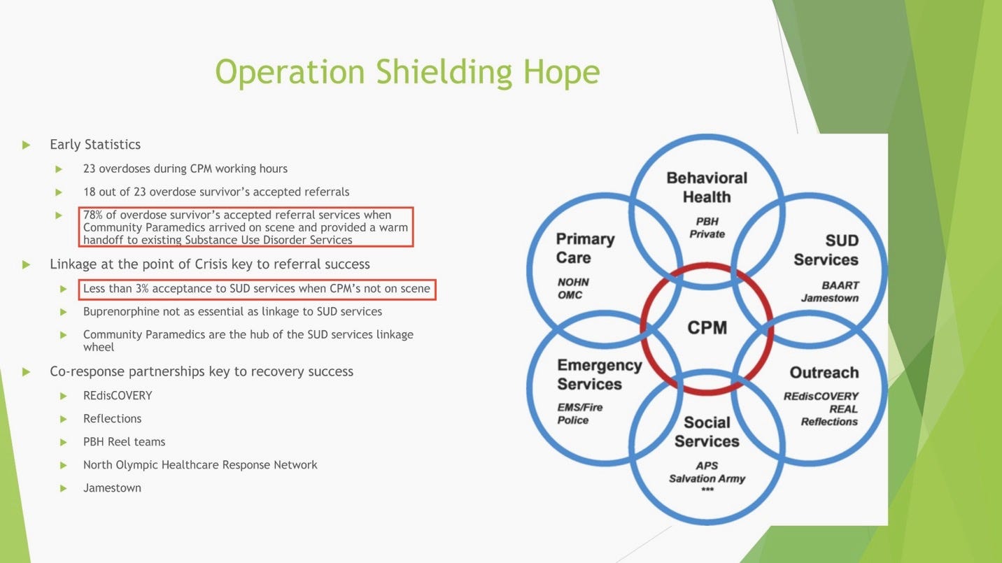 In March 2024 — at the height of Clallam’s overdose death rate — the Port Angeles Fire Department launched Operation Shielding Hope. The program differs fundamentally from traditional harm-reduction strategies. Instead of focusing on distributing supplies or facilitating “safer” drug use, it intervenes at the critical moment immediately following an overdose to connect individuals directly to treatment and recovery pathways.