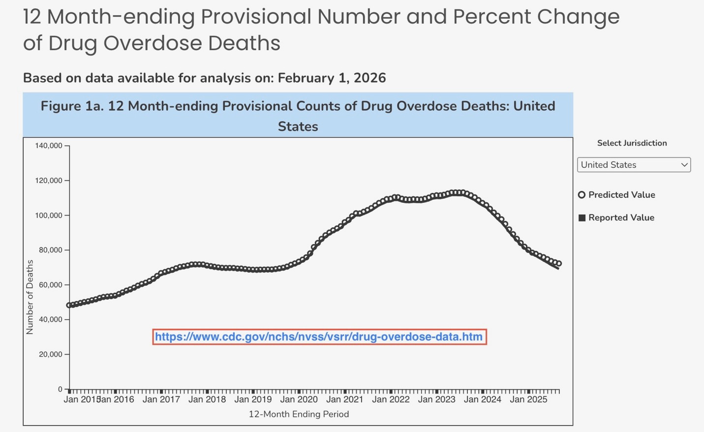 But the declines track national trends. The Centers for Disease Control and Prevention reported that U.S. overdose deaths fell approximately 27% in 2024, followed by another provisional decline of more than 23% in the 12-month period ending August 2025.