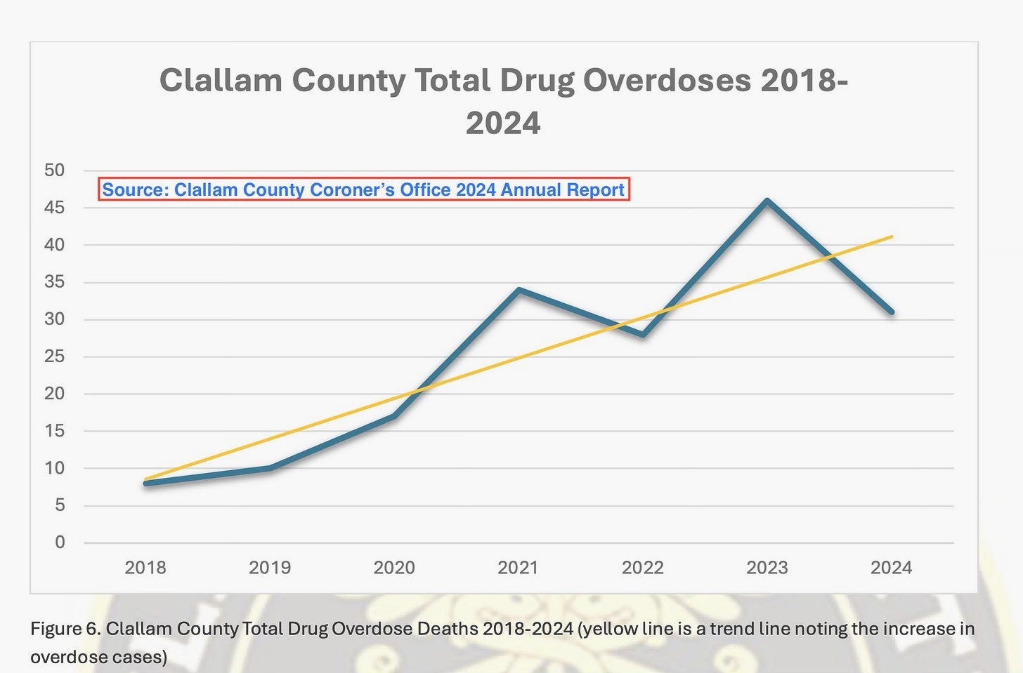 Clallam County’s 25 overdose deaths in 2025 are still more than triple the 8 overdose deaths reported by the Coroner’s Office in 2018.