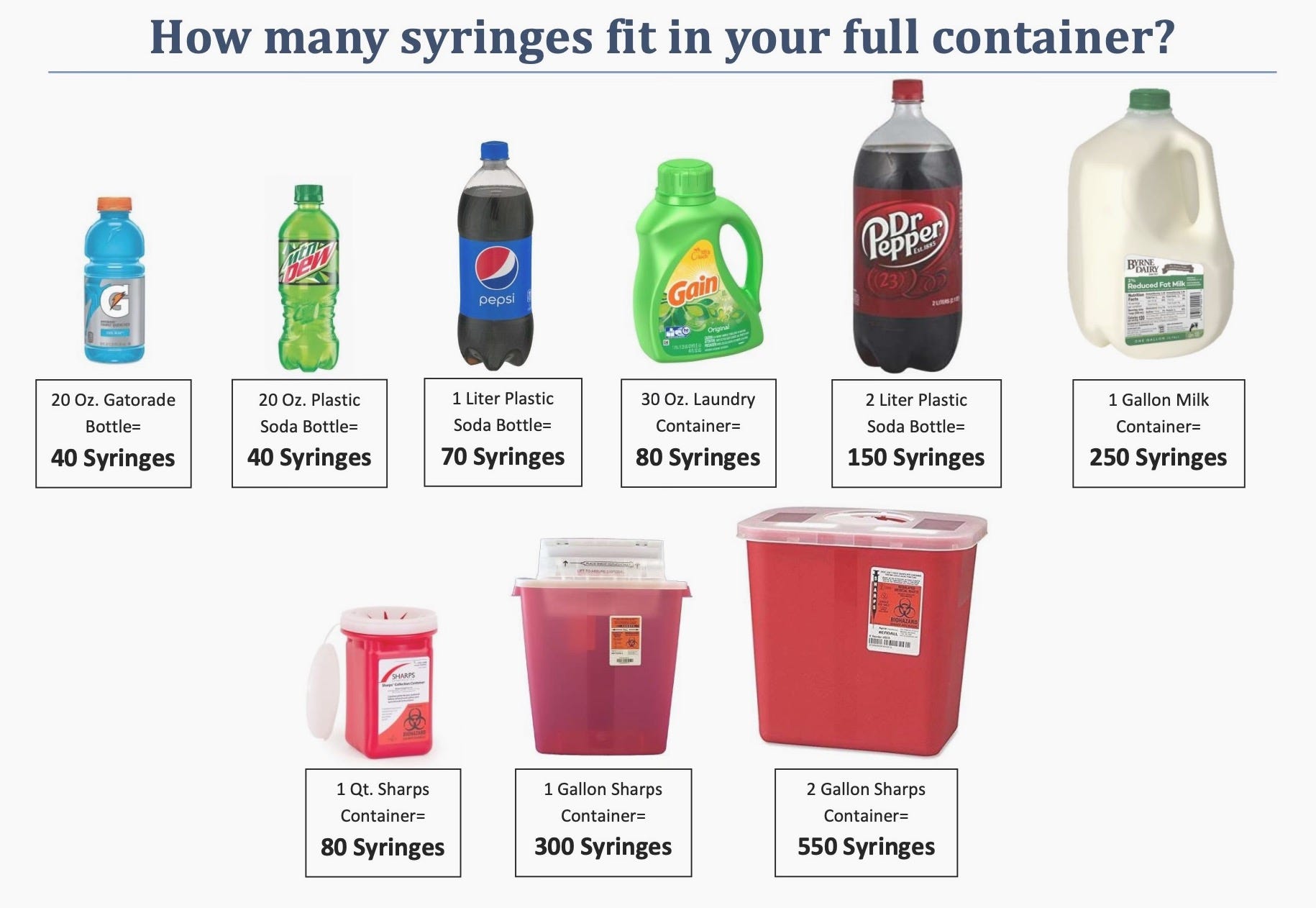 The stated container capacities also appear to be rough estimates rather than precise measurements. According to the chart, a 2-gallon sharps container holds 550 syringes — yet a 1-gallon container reportedly holds more than half that amount. A 1-liter bottle (nearly 34 ounces) is credited with 70 syringes, while a smaller 30-ounce detergent container is listed at 80.