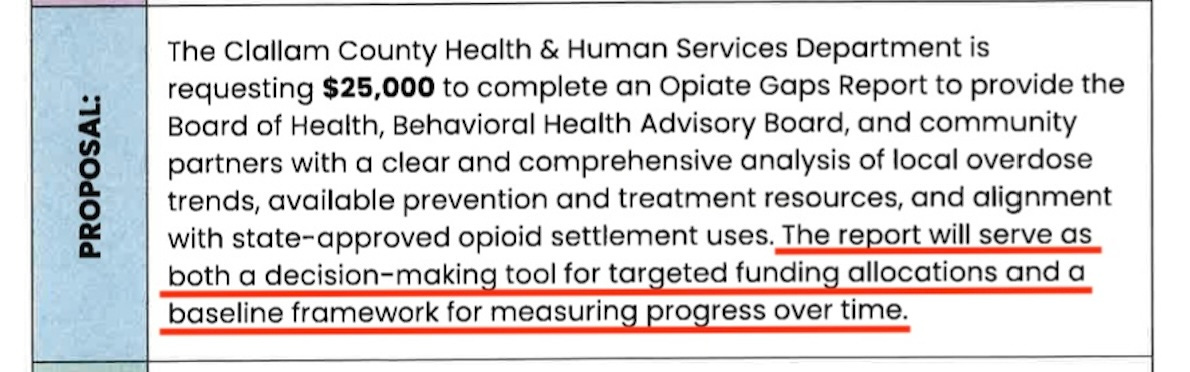 At the September 22 work session, Clallam County Health and Human Services (CCHHS) requested $25,000 to produce an “Opioid Gaps Report,” which they described as a “decision-making tool” for future funding.