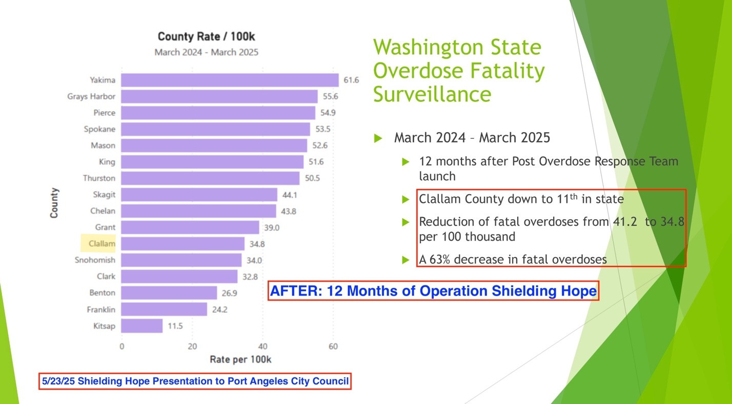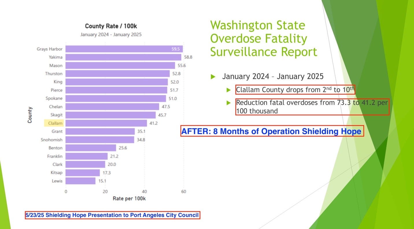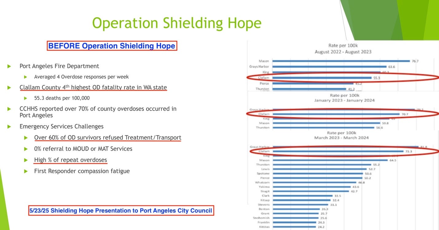 The timing of the decline in overdose deaths aligns not with harm reduction expansion—but with the rollout of Operation Shielding Hope, which the Port Angeles Fire Department launched in early 2024.