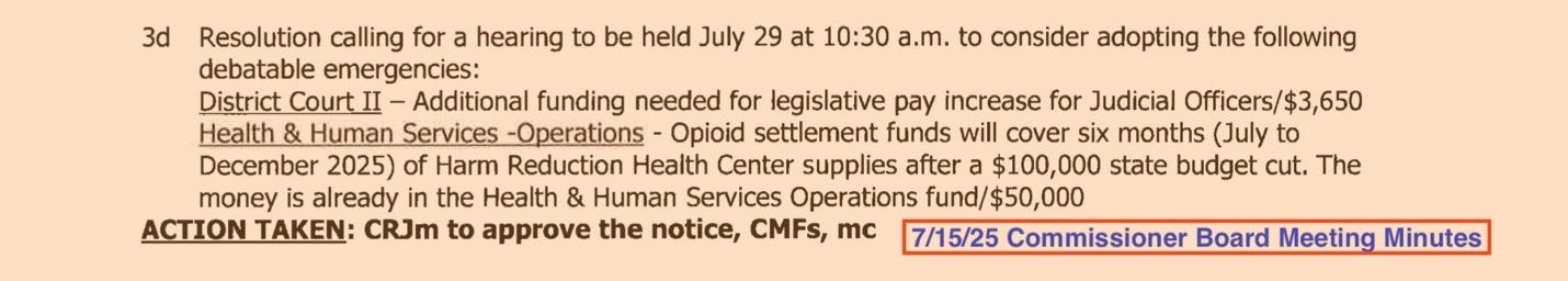 Instead of downsizing, adapting, or reevaluating strategy, CCHHS appealed to the commissioners to backfill the loss with opioid settlement funds — money that is legally allowed for treatment, prevention, housing, and recovery, not just drug-use supplies.