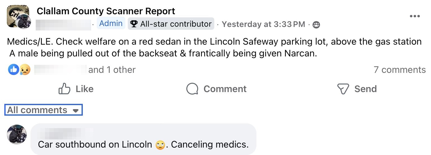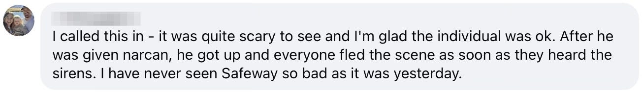 “Just another day in Port Angeles- drove by Safeway around 3 ish, active drug dealing from a vehicle in north side of parking lot with a literal line of customers waiting their turn to approach the window. Drove by about hour and half later and still there, plus another vehicle stuffed full of people next to it had joined the party. Got home checked scanner page to see if there was any activity after my call, just someone getting narcanned in the same area of the lot then the car driving away!