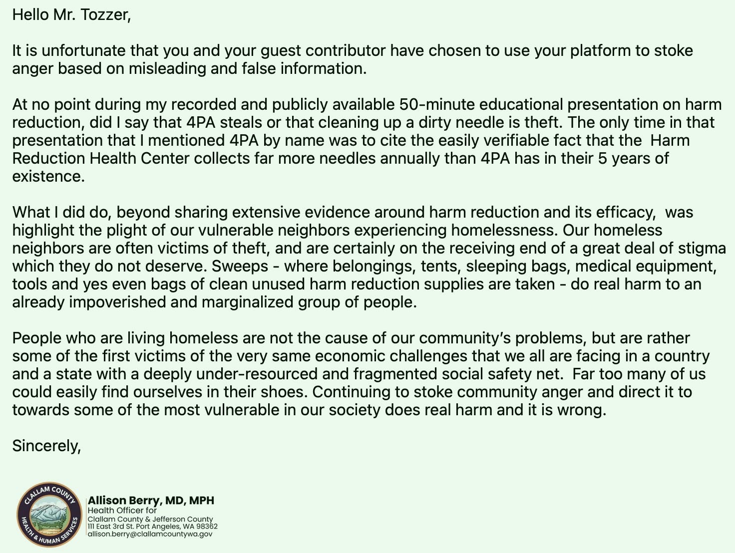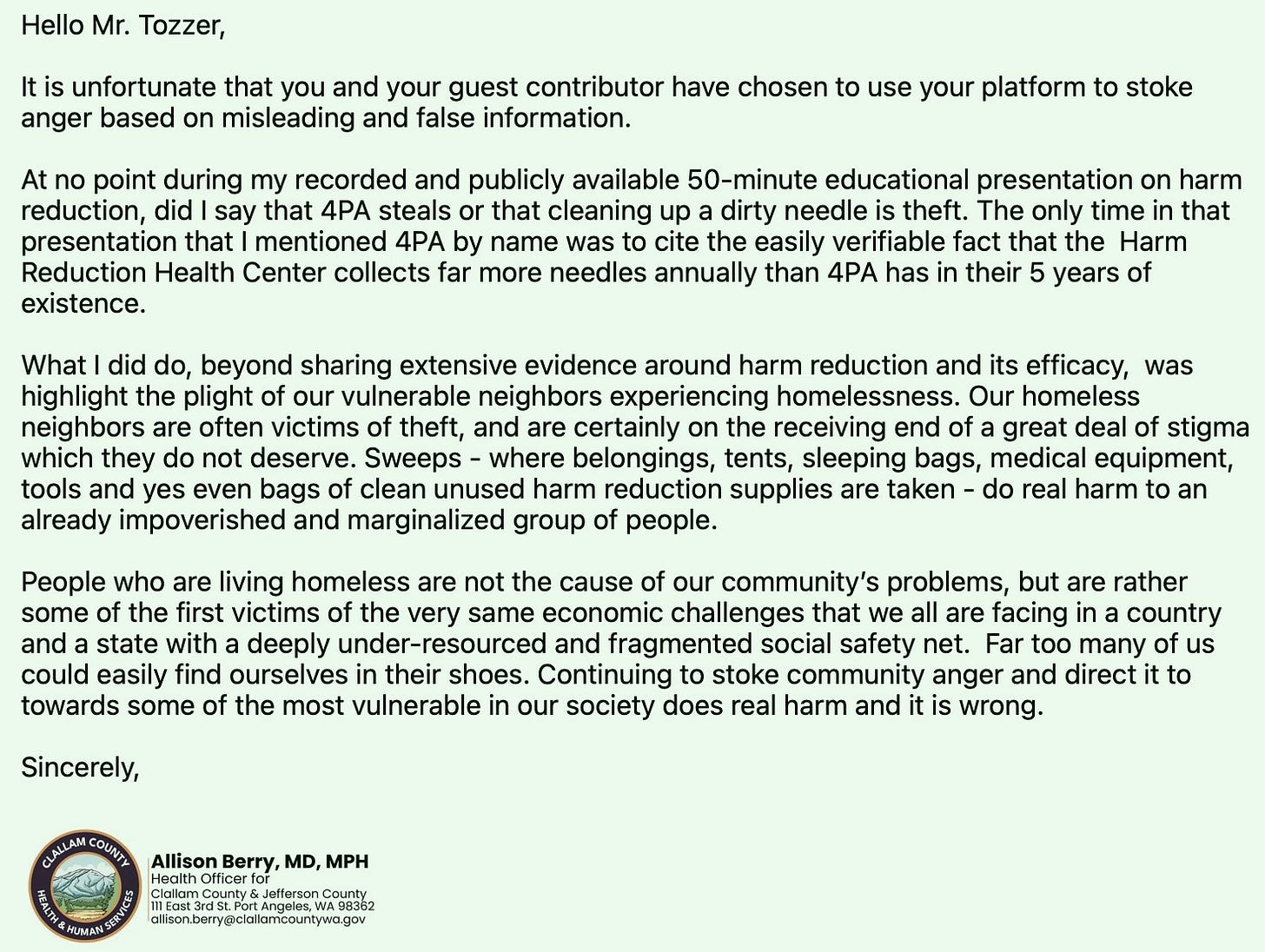 In Port Angeles, there is no ambiguity about who is cleaning up encampments and needles. It is not the county. It is not a tribal agency. It is 4PA, a privately funded nonprofit operating through volunteers. That comment could only have applied to one entity. Dr. Berry did not need to name them — the implication was obvious.