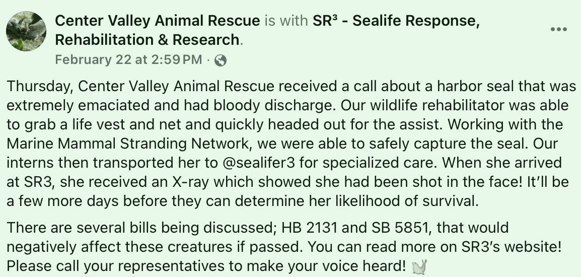 Center Valley Animal Rescue of Quilcene recently captured an extremely emaciated seal for rehabilitation. The animal had been shot in the face, and its likelihood of survival remains uncertain.