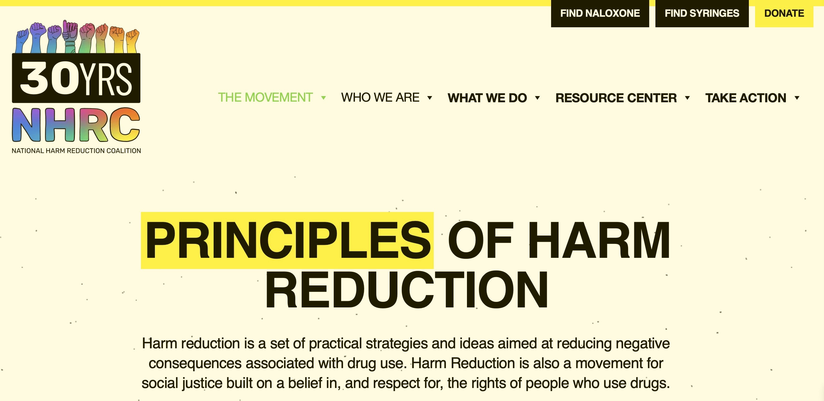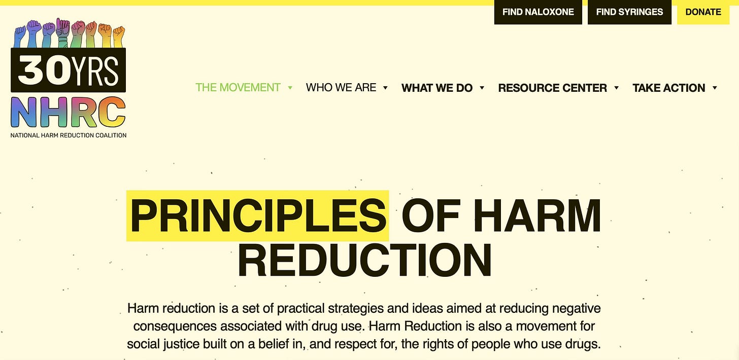 The National Harm Reduction Coalition defines success as quality of life — not necessarily cessation of substance use — and frames harm reduction as a social justice movement centered on the rights of people who use drugs.