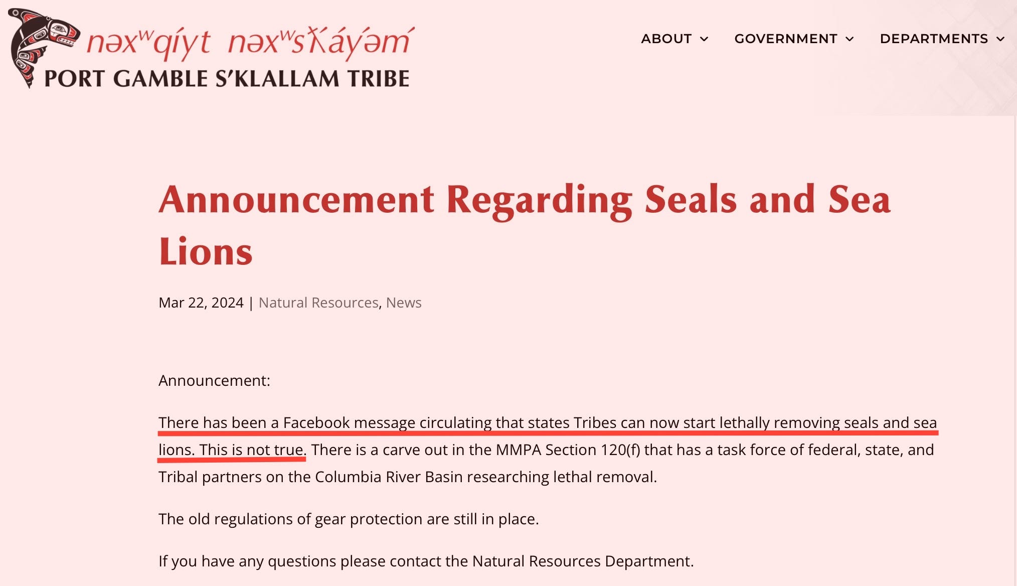 The Port Gamble S’Klallam Tribe issued a reminder that seals and sea lions may not be lethally removed and that questions should be directed to the tribe’s natural resources department.