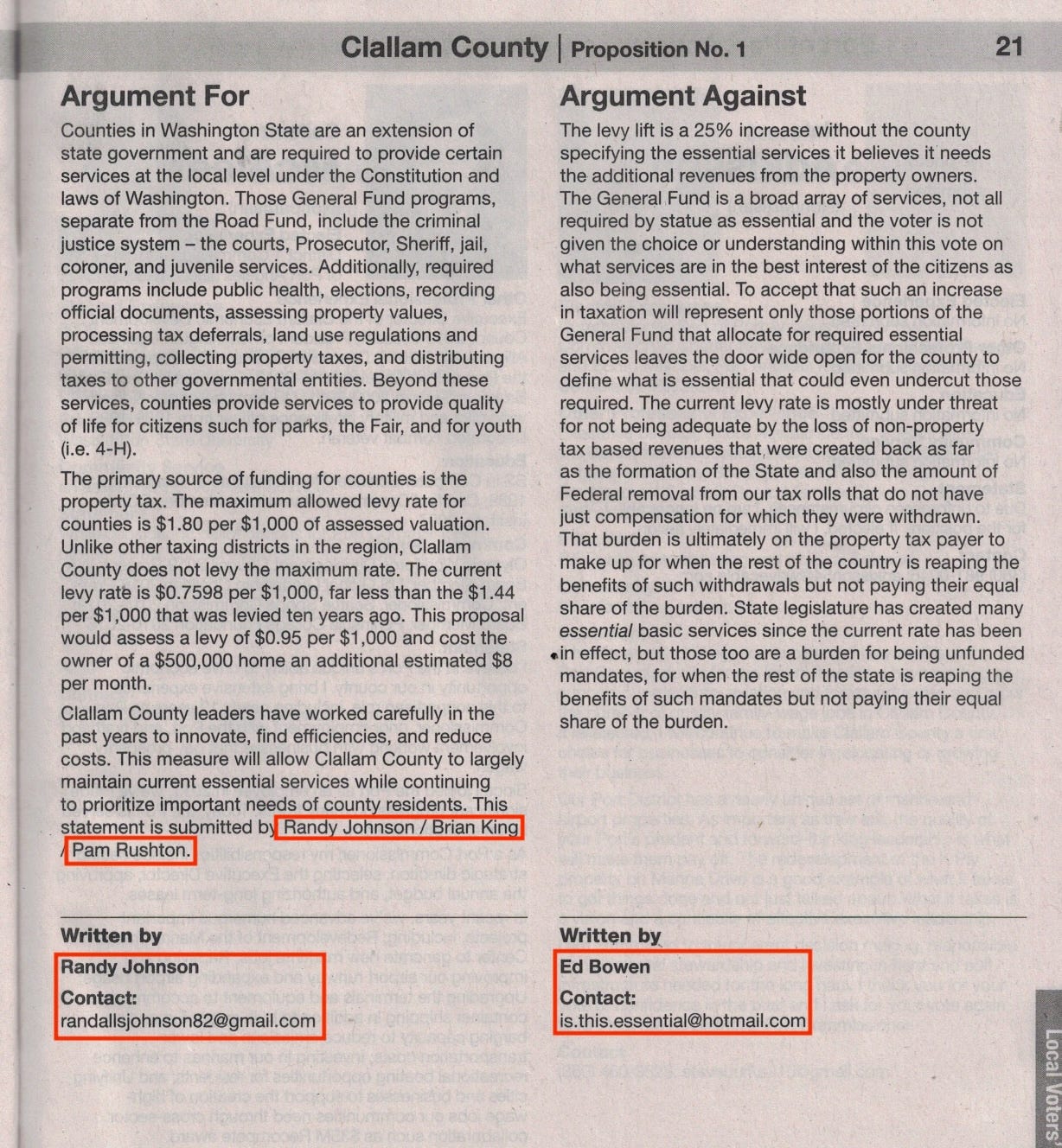 In this year’s Voter’s Pamphlet, the “Argument For” the county’s levy lid lift was written by Commissioner Randy Johnson and endorsed by Assessor Pam Rushton and Sheriff Brian King. Were there no citizens—outside of those on taxpayer-funded payroll—willing to make the case to voters?
