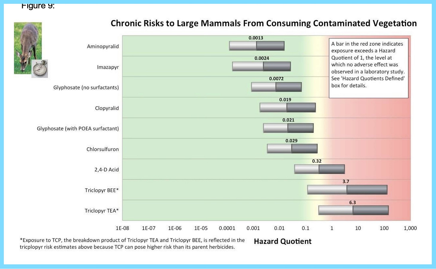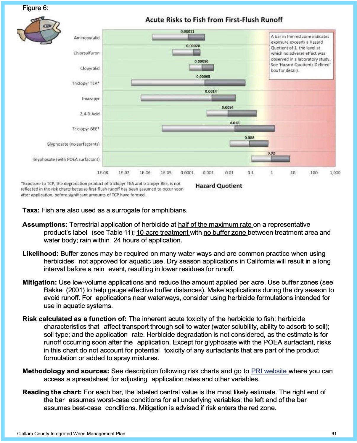 According to the 2025 Clallam County Road Department Integrated Weed Plan, herbicides can be more than just “emotional” for fish and large mammals, with Triclopyr, 2,4-D Acid, and Glyphosate potentially reaching “hazard” levels, depending on concentration, application techniques, and unpredictable weather.