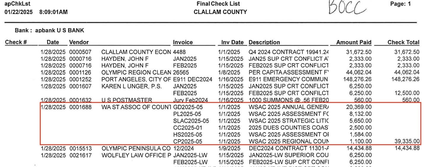 In January 2025, county vouchers show $39,335 in dues and fees paid to WSAC.
