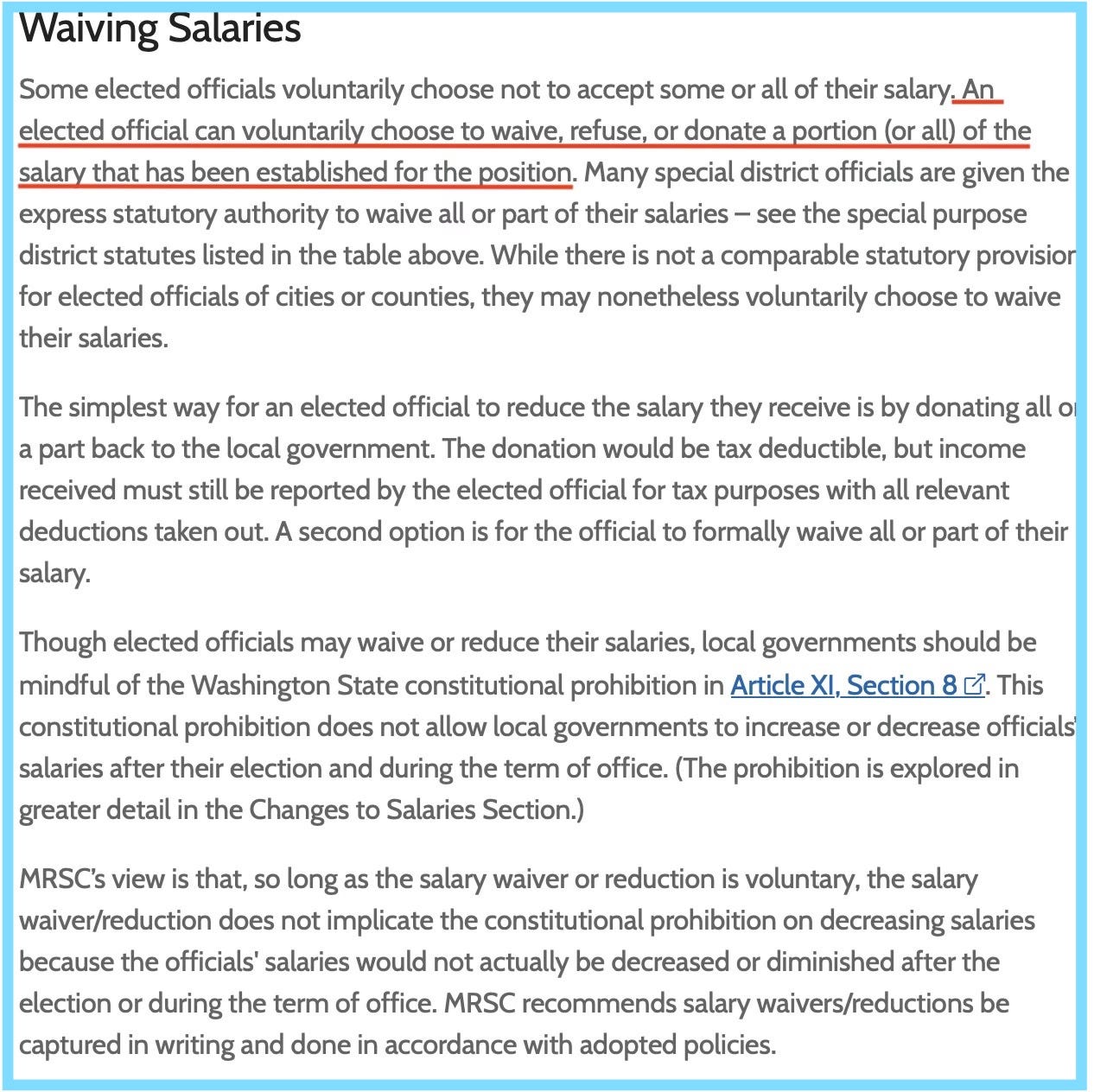 However, according to the Municipal Research and Services Center (MRSC.org), elected officials may voluntarily waive, refuse, or donate all or part of the salary established for their position.