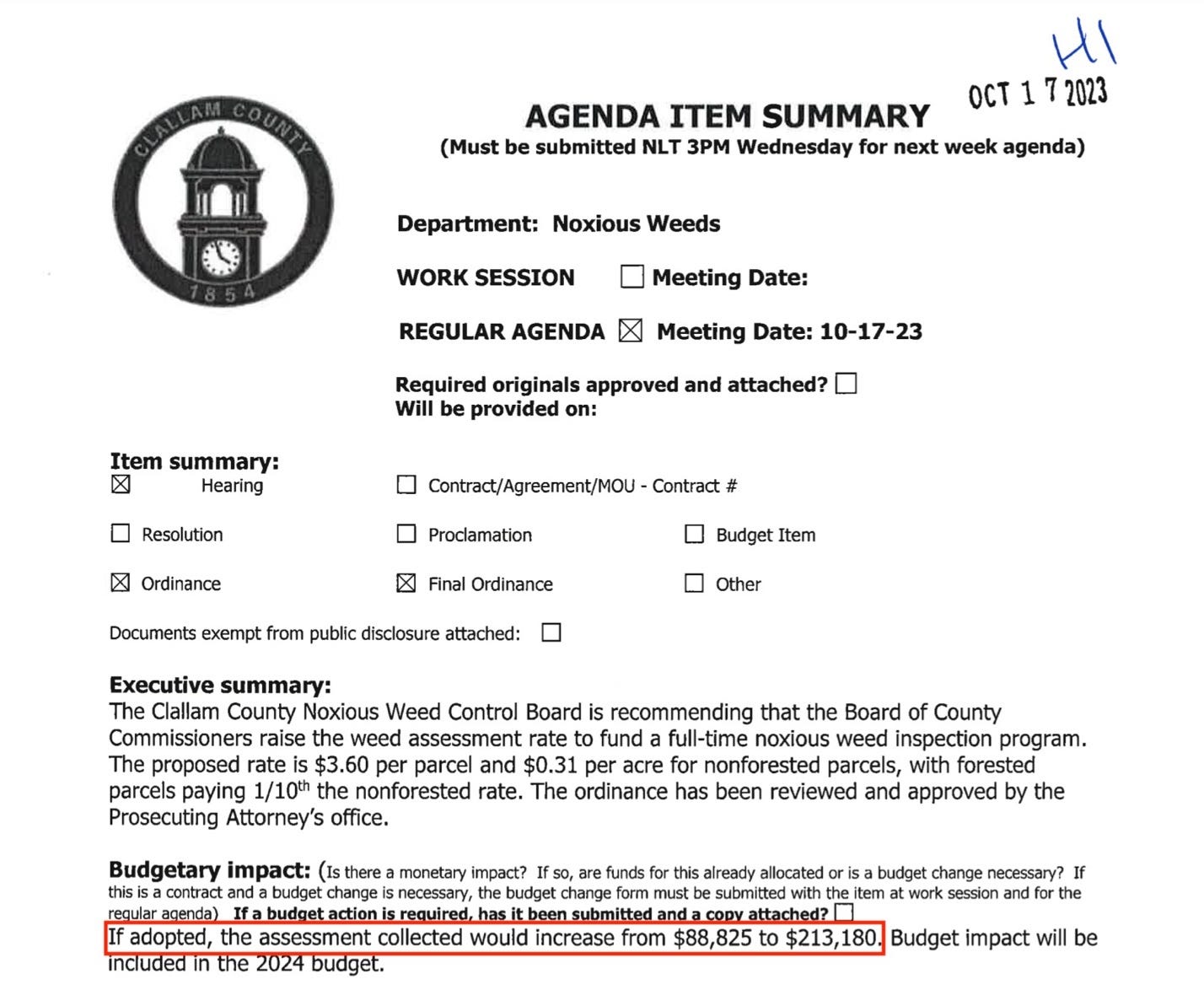 On October 17, 2023, Commissioners French, Johnson, and Ozias unanimously passed Ordinance 1009, raising the Noxious Weed Assessment to $3.60 per parcel and $0.31 per acre (forested parcels pay one-tenth that rate). Federal and tribal lands are exempt.