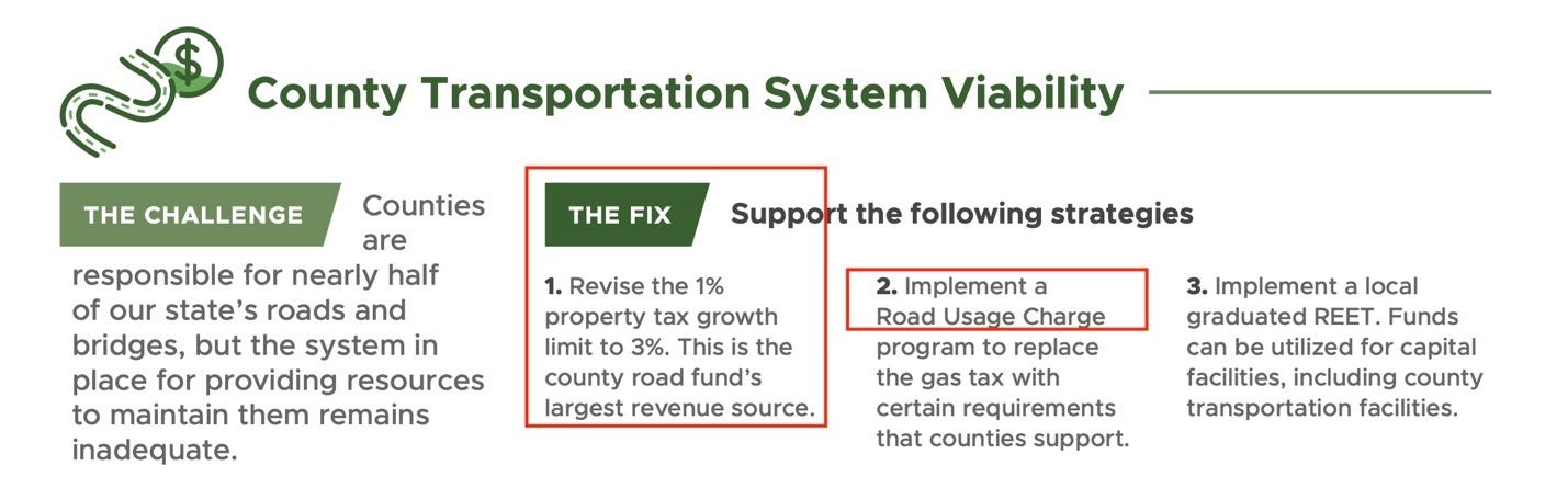 Increasing the county-road levy cap to 3% and adding a mileage fee for drivers.